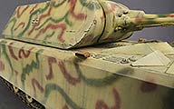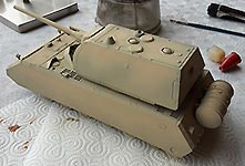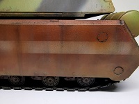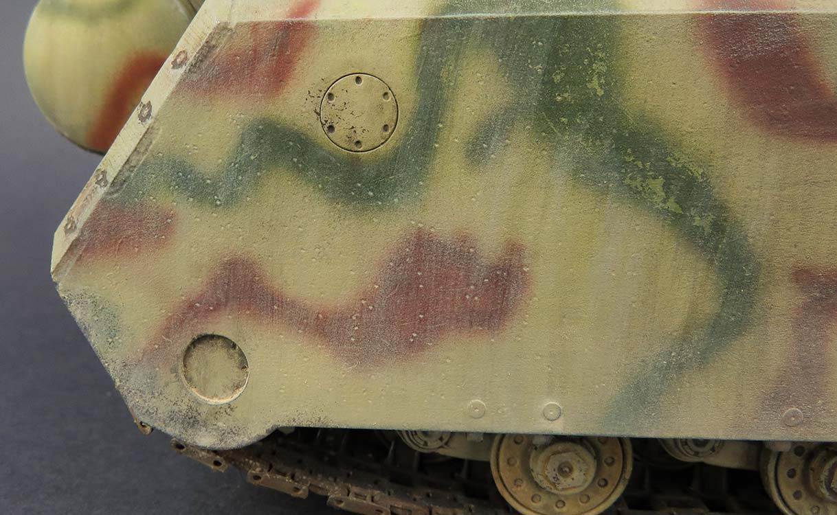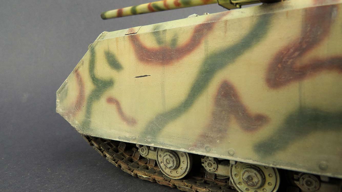 In meinem Buch finden sich einige Fotos die Maus-Wannen und Türme während der Produktion zeigen. Diese weisen große weiße Farbmarkierungen auf. Daher lackierte ich ebenfalls einige großflächige Markierungen an der Front und den Seiten der Wanne. Dazu klebte ich die entsprechenden Bereiche am Modell ab und lackierte sie mit der Airbrush. Dabei verwendete ich ein mit Dunkelgelb abgemildertes Weiß und lackierte es vorsichtig in dünnen Schichten. Einige Stellen erhielten keine Farbe, in einigen Bereichen brachte ich nur einen dünnen Farbschleier auf, stellenweise trug ich die Farbe auch etwas kräftiger auf. Dadurch wirkten die weißen Markierungen schon abgenutzt.