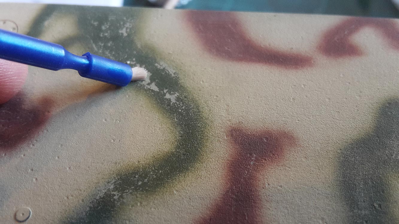 Ich habe daher mit einem härteren Pinsel und Wasser die Tarnstreifen gezielt wieder etwas abgerieben - das resultierte in tollen Chipping Effekten (sollte ich mir für weitere Projekte merken), aber nicht ganz so streifig, wie ich es mir gewünscht hätte. Dennoch ist das gebrauchte Aussehen der Tarnstreifen jetzt etwas gefälliger, auch wenn es zunächst so aussieht als ob die Bemalung schiefgelaufen ist.
