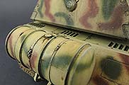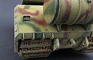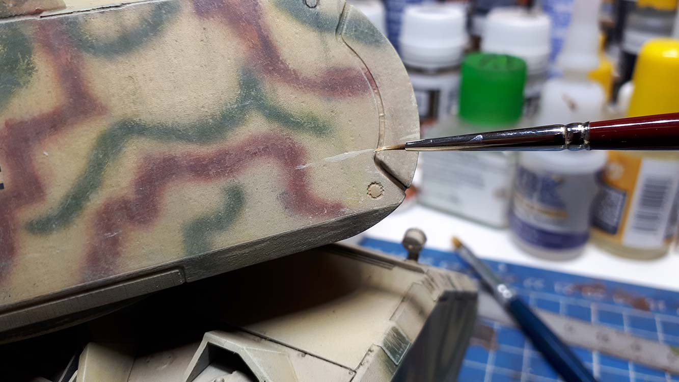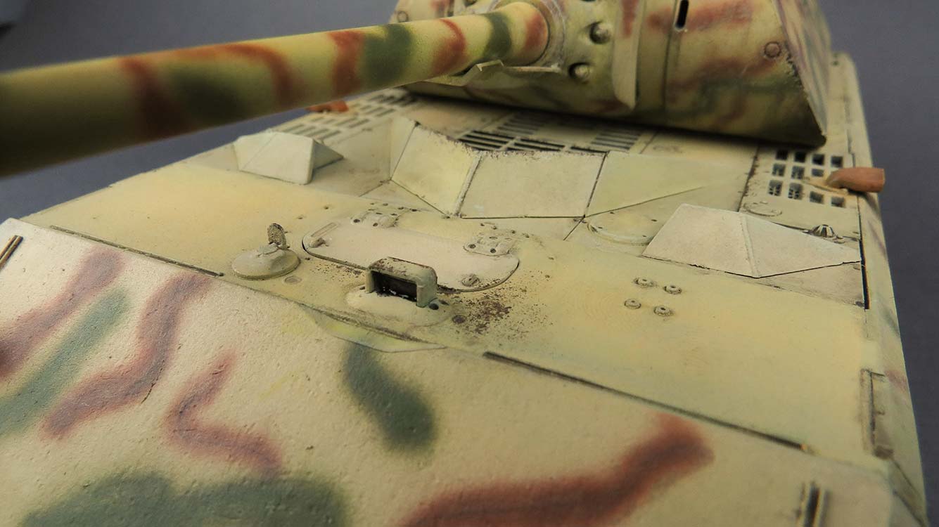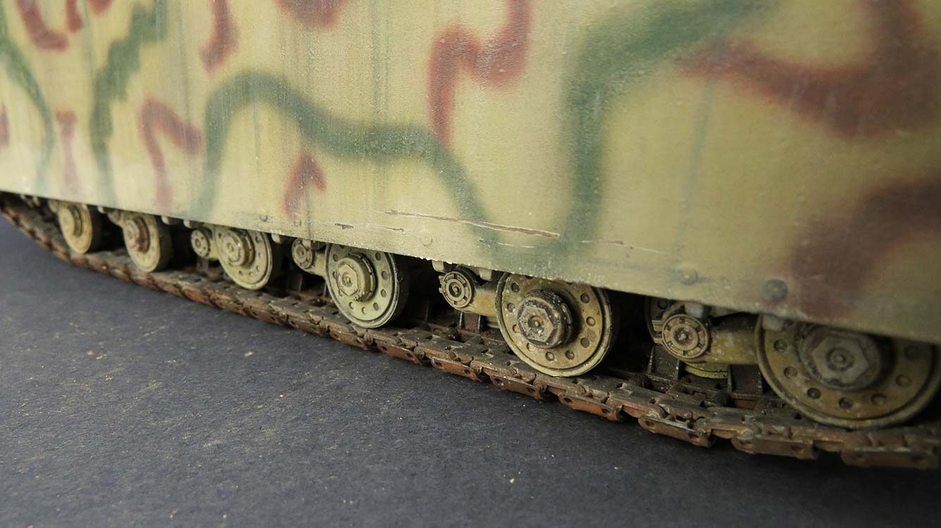 Gerade die umlaufenden Rillen am Turmdach und die Schweißnähte der verzahnten Panzerplatten, wie auch die Laufrollen mit den Löchern sind dankbare Abnehmer desdunklen Washings. Durchgeführt habe ich dieses mit Amig 1001 DAK Wash, das sich mit dem Tarnmuster auf dunkelgelb sehr gut verträgt.