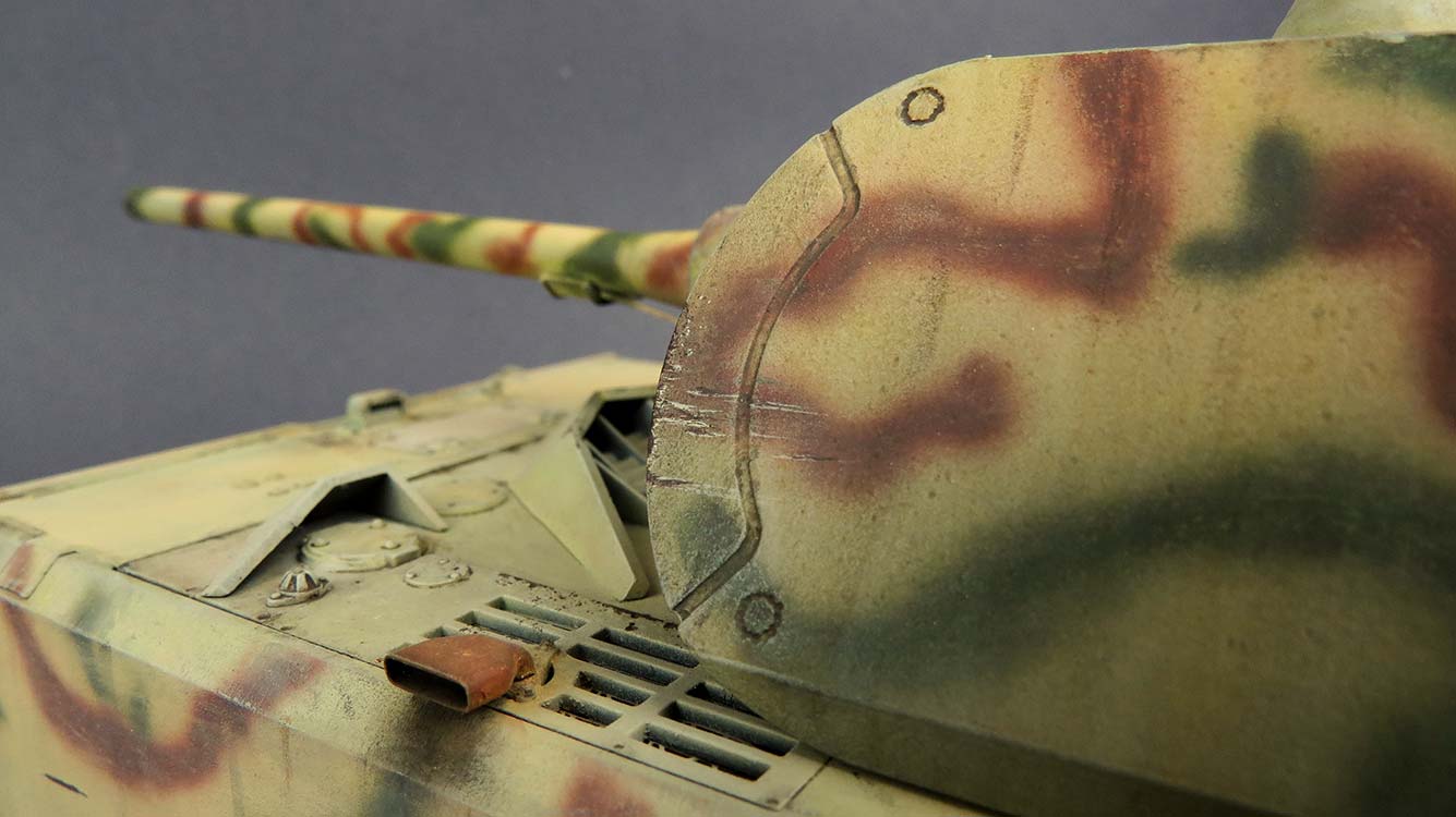 Das fängt bei der sehr schönen Darstellung der leicht rauen Oberflächenstruktur der Panzerplatten an und geht über die Schnittkanten der Panzerplatten und Schweißnähte bis hin zur endlich korrekten Kanonenblende mit den dicken Sechskantbolzen am Turm.