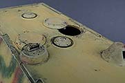 A n Kanten des unteren Laufwerks, sowie auf dem Wannen- und Turmdach, insbesondere um die Luken herum an denen viel Abrieb entsteht, habe ich mit dem Pinsel größere Flecken gepinselt, die nach aussen hin unregelmäßig nach aussen hin kleiner werden. Für weitere Unregelmäßigkeiten und noch kleinere Farbchips habe ich mit einem kleinen Stück Schaumstoff die helle Farbe aufgenommen und auch abgetupft, bis kaum noch Farbe enthalten ist. Damit habe ich dann die genannten Bereiche noch weiter verfeinert, denn nur damit bekommt man schöne winzige und unregelmäßige Farbtupfer hin.