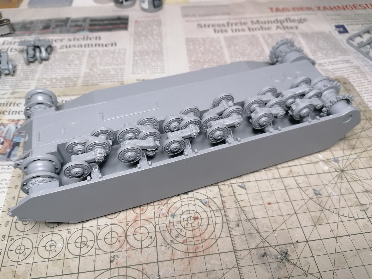 An der Unterwanne baut sich das enorm umfangreiche Laufwerk mit 48 Laufrollen in 12 Laufrollenwagen an. Dabei bleiben die Laufrollen drehbar und die je zwei Laufrollenarme bleiben im gewissen Rahmen beweglich. Dies ist im Vergleich zur Dragon Maus eine enorme Verbesserung - auch, bzw. insbesondere die Darstellung der Detatils an Laufrollen und Laufrollenwagen mit Federungselementen. Das Ganze wäre nur noch steigerbar wenn die Kegelstumpffedern selber auch noch funktionsfähig wären.