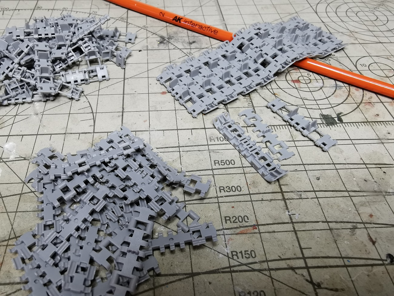 Das Aufwändigste dürfte das Heraustrennen der Kettenglieder vom Spritzling sein, denn diese sind mit 6, 8 und am Hauptglied mit 12(!) Angüssen versehen. Das ergibt zwar ein tolles Ergebnis, macht aber irre Arbeit.