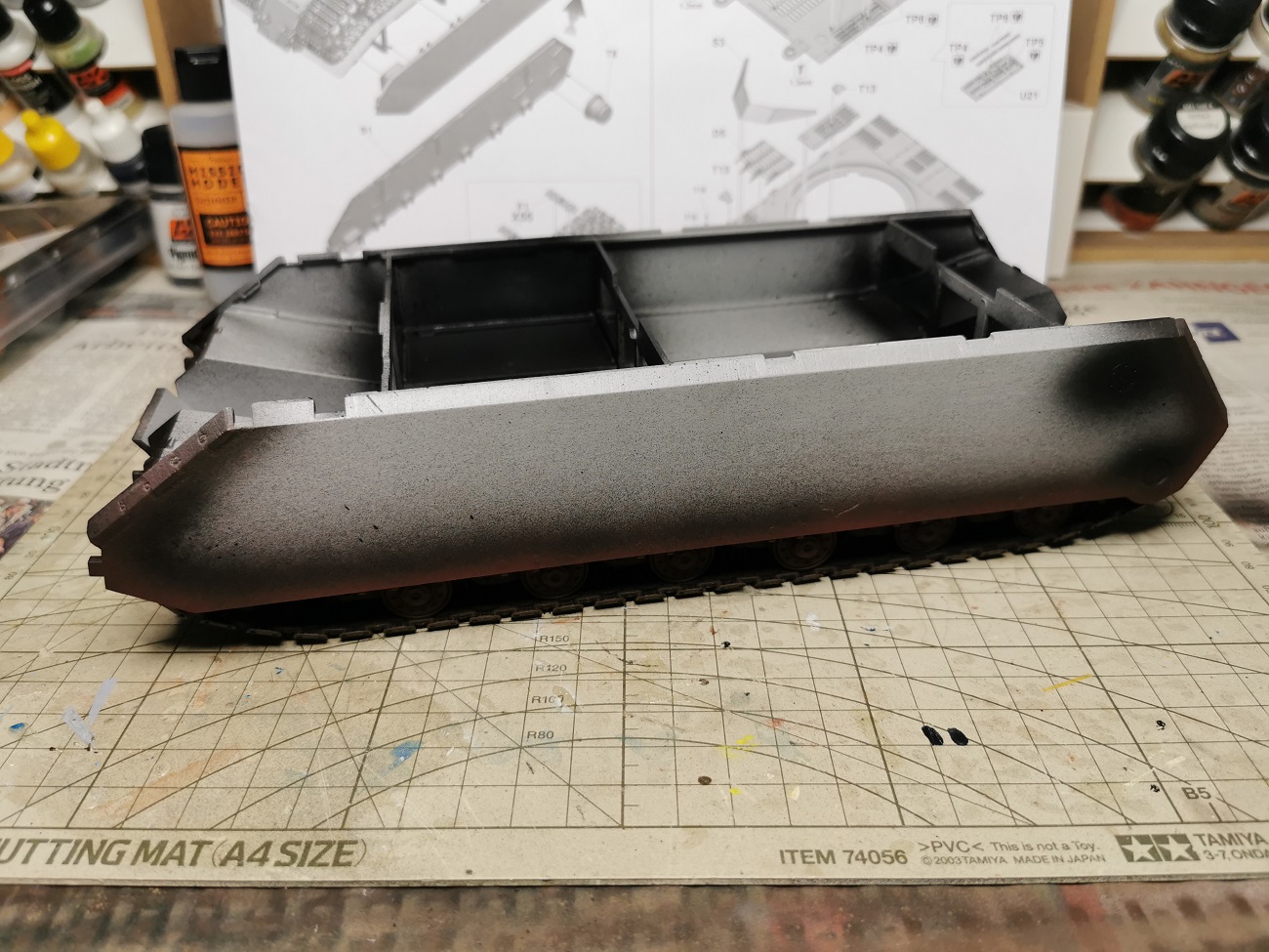Ich testete den Sitz der Rollenwagen zunächst, prüfte die Ausrichtung und die Beweglichkeit und war angenehm überrascht: Alles passte wunderbar zueinander. Nun konnte alles verklebt werden und die großen seitlichen Schürzen montiert werden. Bevor ich nun das Oberdeck der Wanne montierte grundiert ich das Laufwerk und den inneren Bereich der Wanne in schwarz. Ich hatte die Befürchtung, dass man durch die großen Lüftergitter später den hellgrauen Innenbereich der Wanne sehen könnte.