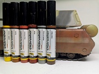 Danach geht ans filtern, d.h. verschiedene Ölfarben wie gelb, grün, braun, ocker, blau, orange, usw. in dünnen Punkten auf dem Modell aufgetupft ... ich habe teilweise die Grundfarben damit etwas nachbearbeitet oder betont und auch die einzelnen Tarnfarben miteinander etwas harmonisiert und verschiedene angrenzende Flächen etwas voneinander abgegrenzt werden. Dazu wurden diese Punkte dann mit einem weichen Rundpinsel und Verdünner auf dem Modell verteilt und miteinander und der Grundbemalung verblendet. Dazu den Pinsel immer wieder ordentlich säubern um nicht einen wilden Farbmix weiter und weiter gleichmäßig zu verteilen, sondern spezifisch die Farbe in Arealen zu belassen.