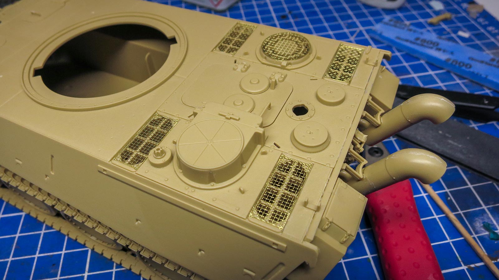 Dann geht es an die Verfeinerung der Oberwanne - am Motordeck wird die Motorraumklappe angebaut und das entweder offen oder geschlossen, die Lüfter bekommen sehr schöne PE Gitter, die man mit Sekundenkleber vorsichtig aufklebt. Wahlweise kann man die rechten Lüfter noch mit den zusätzlichen Schiebern on Top versehen - und nicht irritieren lassen, das ist schon richtig, dass diese nur 2x für die rechte Seite enthalten sind. Der linke Lüfter mit der Kampfraumheizung ist das einzige Teil, das man hätte etwas besser machen können, denn die Abdecksegmente wurden allesamt im abgedeckten Zustand des Lüfters angespritzt. Hier wäre die offene Version oder zumindest ein Optionsteil schön gewesen. Aber das ist Jammern auf hohem Niveau und diese Darstellung ist ja nicht falsch.
