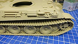 Die Unterwanne ist einteilig und hat die wichtigsten Details des Laufwerks bereits mit angespritzt. Die Laufrollen kommen in den innerten Reihen als zusammenhängende Spritzguss Teile, die dadurch mit wenigen Angüssen auskommen und mit einem Rutsch auf dem Laufwerk sind. Hier spart man eine Menge Zeit und man kommt gleich zu Anfang schnell voran, was gut für die Motivation ist. Die Details der Laufrollen können sich absolut sehen lassen, schöne, scharfe Details und Ausformung der Felgen und Gummierung. Sogar eine superfeine Beschriftung auf den Gummierungen ist zu finden! Die Kette ist eine sehr gut gemachte Segmentkette, die statt einem Haufen Einzelglieder für die Umläufe bereits passend abgewinkelte Zweierpacks behinhaltet. Alle Segmente sind je einteilig und dabei schön und sauber detailliert. Die langen Segmente sind je nach Position auch bereits mit entsprechenden "Durchhang" versehen. Sehr realistische Wirkung und damit keine Mühen für den Modellbauer. Auch höchst erfreulich, dass quasi keine Auswerfermarken zu sehen sind - das ist etwas das sonst oft bei anderen Hersteller unangenehm ins Auge fällt. Dadurch dass die Kettenteile einteilig sind mit angespritzten Führungszähnen, sind diese mit den späten, geschlossenen Zähnen dargestellt. Nicht falsch verstehen: Es gibt definitiv Panther Ketten mit geschlossenen Führungszähnen, man sieht aber wenige Originalfotos, die diese an Panthern zeigen.
