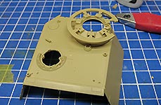 Dann geht es an die Wannenheckwand. Hier sind erstmal zwei rechteckige Erhebungen abzutrennen und wer den IR Staukasten anbauen will, muss rechts die Nupsis auch abtrennen und stattdessen von innen zwei Löcher aufbohren. Leider schweigt sich die Anleitung darüber aus, wofür dieser Arbeitsschritt gemacht werden muss - aber der findige Modellbauer findet es heraus. Außerdem, und das übersieht man schnell, muss das oberste Loch dann auch zugespachtelt werden. Wer den regulären Staukasten nutzt, braucht allerdings nichts davon zu beachten.