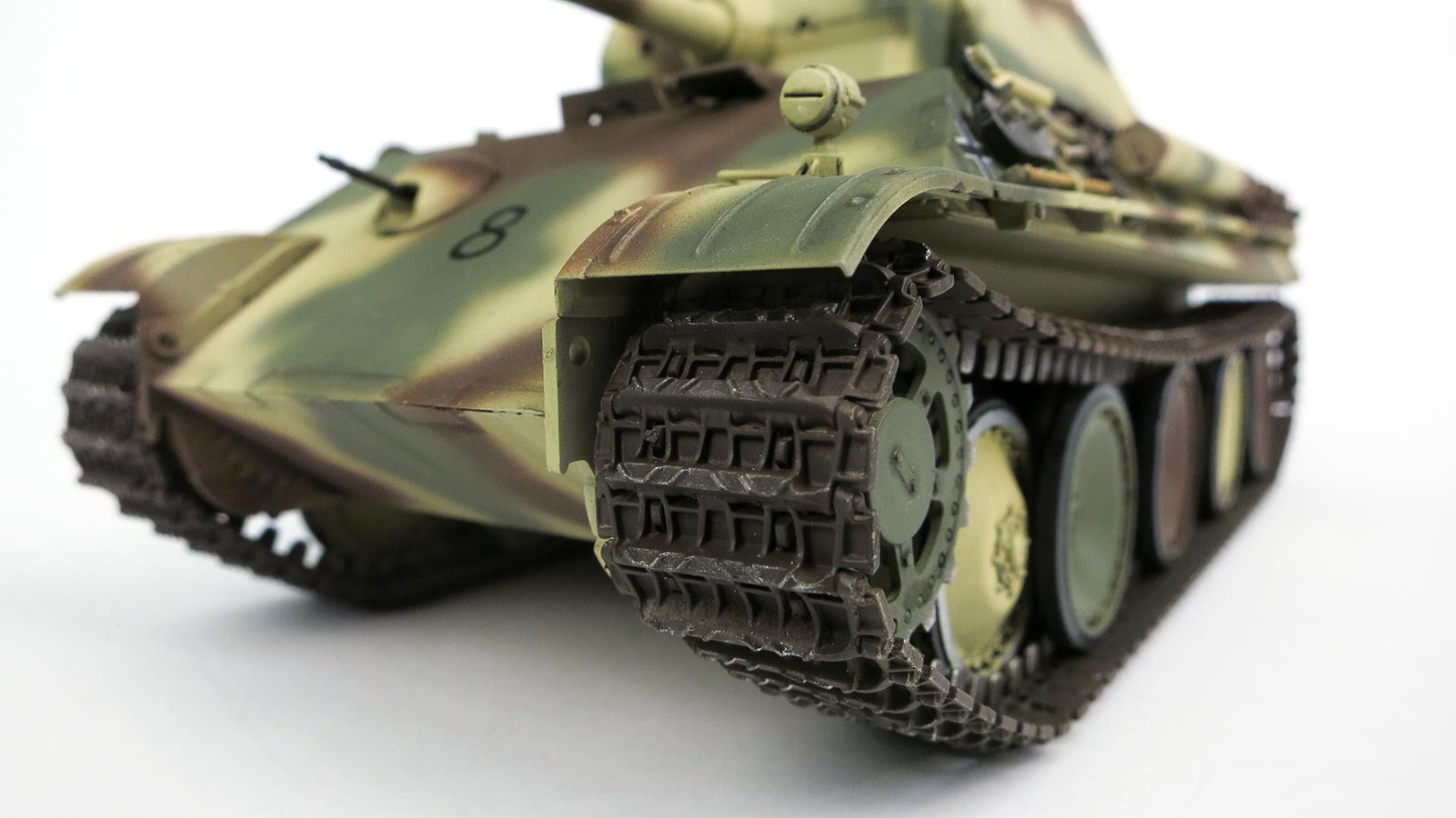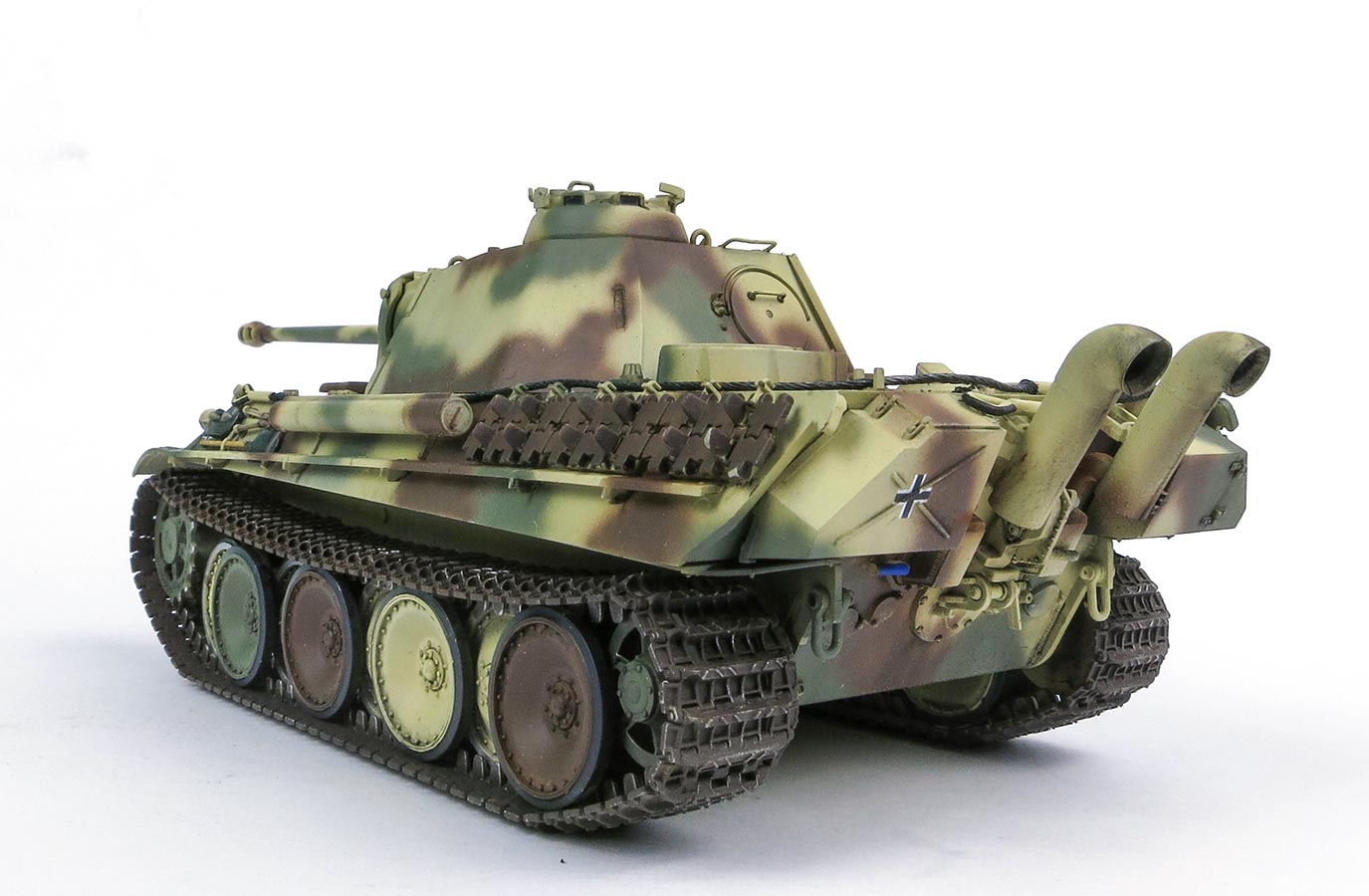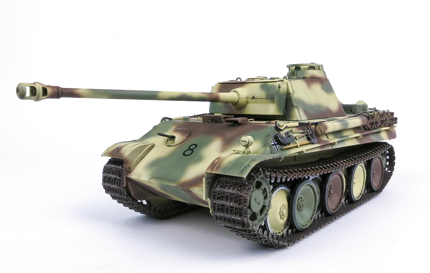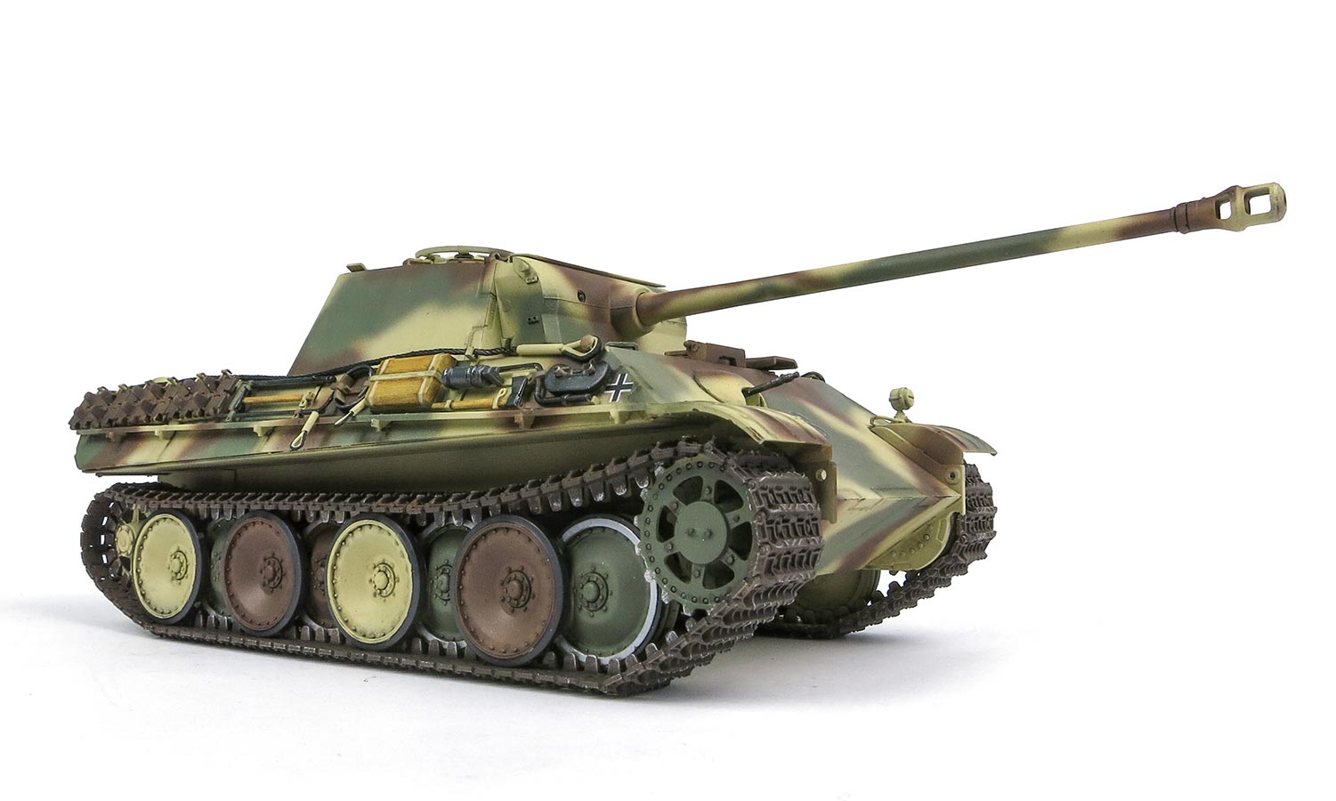 Im Dezember 1941 wurde an Daimler Benz und MAN der Auftrag zur Entwicklung eines neuen Panzers der 30 Tonnen Klasse gegeben. Im März 1942 wurde von führenden Politikern der Daimler Benz Entwurf gebilligt, eine Sonderkommission entschied sich jedoch im Mai 1942 für den MAN Entwurf! Ab Januar 1943 folgte die Produktion des Panther, zunächst als Panther D, von dem bis September 1943 842 Stück produziert wurden. Es folgte der verbesserte Panther A, der von August 1943 bis Juli 1944 mit 2200 Einheiten produziert wurde. Der darauf folgende Panther G wies weitere Verbesserungen auf, wie partiell verstärkte Panzerung, Fahrersehklappe in Glacisplatte entfällt für schwenkbaren Winkelspiegel, andere Munitionslagerung, Stoßdämpfer Änderung, Änderung des Wannendecks, usw.. Im Laufe der Produktion wurden weitere Änderungen vorgenommen, wie die Einführung der "Kinn"-Kanonenblende, Kampfraumheizung mit Änderung des linken Lüfters, Flammvernichter und eine begrenzte Serie von 24 Panthern bekam gummigefederte Stahllaufräder. Die Produktion der Panther G ab April 1945 wies noch einige weitere kleine Änderungen auf, wie z.B. eine Halterung in der Turmdachmitte für Anbringung eines Orterkompasses, Wegfall der MG Schiene an der Kommandantenkuppel und Anbringung eines Stiftes für das Fla-MG, drei Halterungen am Turm für Losterkennungstafeln, 5 U-Ringe an den Turmseiten für Anbringung von Tarnmaterial, größere Abdeckung für den Fahrerwinkelspiegel, Flammvernichterauspuffrohre, 80cm Stahllaufrollen am letzten Schwingarm und ein vergrößertes Leitrad. Davon wurden allerdings nicht alle Bauteile konsequent von allen Produktionsfirmen umgesetzt und so gibt es verschiedene Mischformen
