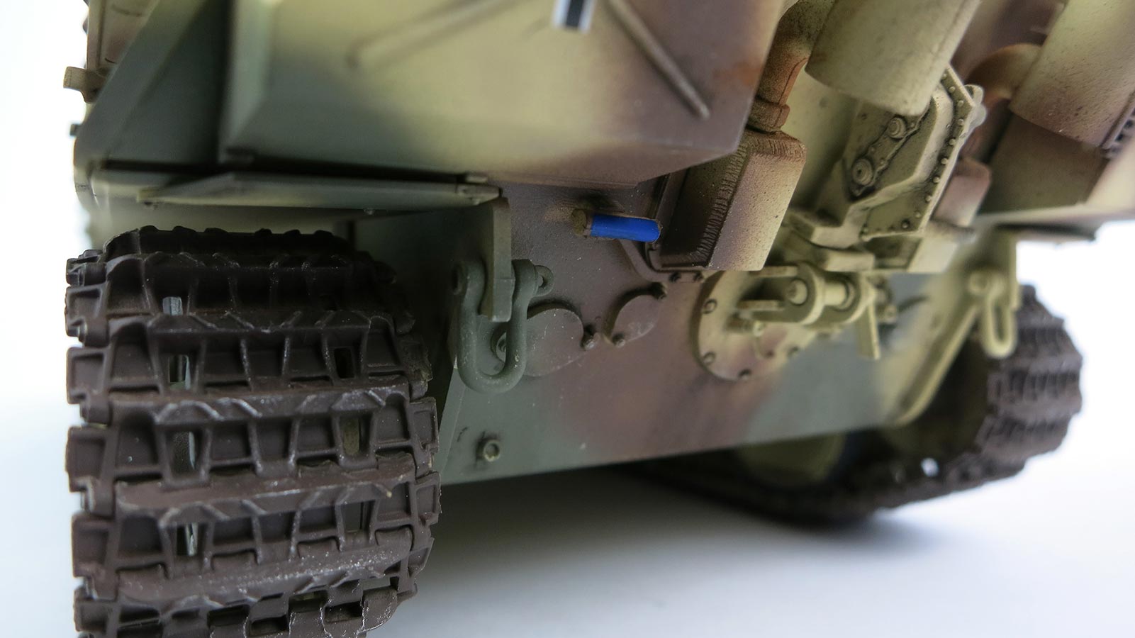 Nach dem Aufbringen der Grund- und Tarnfarben überlegte ich wie ich das Model am besten und schnellsten bemalen kann, Ketten und Werkzeuge hat Thomas festgeklebt, d.h. mir bleibt nur die Bemalung am fertigen Modell vorzunehmen, eine Aufgabe, um die ich mich bisher erfolgreich gedrückt habe, da die eingesparte Zeit beim Basteln mit auswendigen Maskier und luftanhaltender Detailbemalung einher geht.