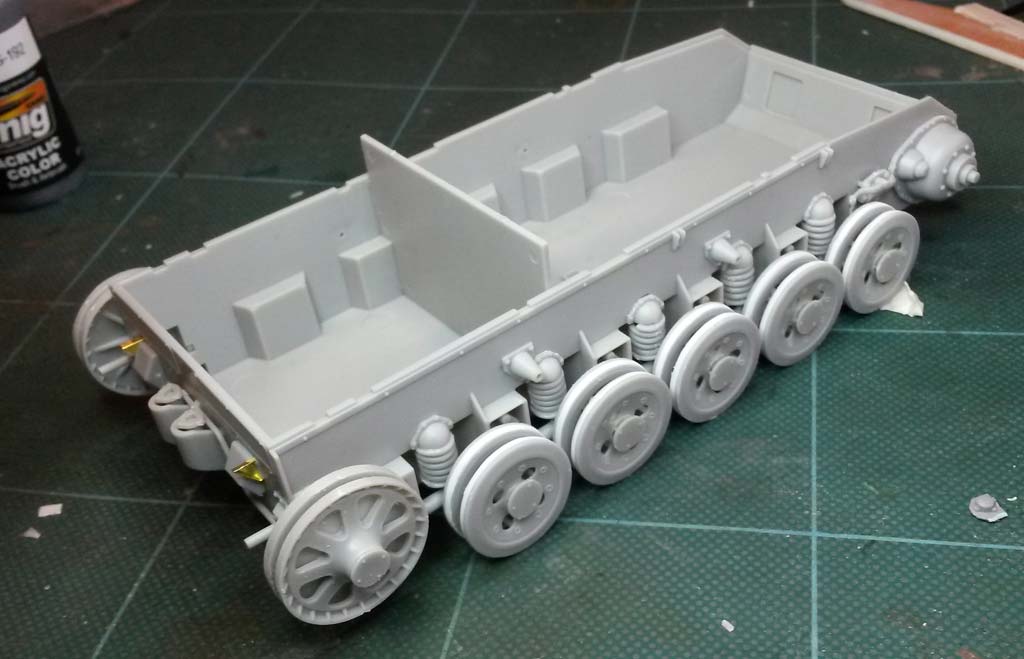 Aufpassen muss man an der linken Seite an der letzte Radstation - hier muss der Schwingarm mit Feder angeklebt werden, BEVOR Teil D10 an die Wanne geklebt wird. Die Vorgelege werden auch an die Wannenseite geklebt und sitzen ziemlich perfekt. An der Vorderseite muss noch eine kleine runde Abdeckung aus PE Teilen aufgeklebt werden.