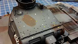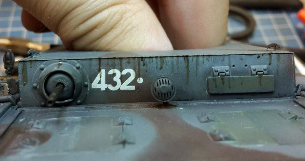 Danach geht es dann ans Trockenmalen. Ich habe dazu sehr hellgraublaue Ölfarbe angemischt und dann mit einem festen Flachpinsel etwas der Ölfarbe aufnehmen und ordentlich auf Pappe ausstreichen bis nur noch ein Hauch Farbpigmente am Pinsel verbleiben. Mit diesem werden dann Ecken, Kanten und erhabene Details abgestrichen wo die Ölfarbpigmente dann an diesen hängenbleiben und mit dem hellen Ton diese dann extra betonen. So bekommt der Panzer Konturen und sichtbare Details, die sonst verborgen geblieben wären. Zudem fördert es zusammen mit dem dunklen washing den Effekt von Tiefe am Modell. Und wieder sollte man danach alles ordentlich trocknen lassen bevor es mit dem nächsten Schritt weitergeht.