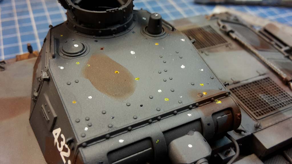 Dann wird das Modell gefiltert - dazu habe ich verschiedene Ölfarben in kleinen Punkten auf dem Modell verteilt. Dabei habe ich auf den horizontalen Flächen eher hellere Farben und nur vereinzelt dunklere Farben genutzt - nach unten hin, insbesondere im Laufwerksbereich dann umgekehrt. Hauptsächlich kamen gelb, ockertöne, braun und rot sowie blaue Ölfarbe hierbei zum Einsatz. Diese wurden dann mit einem sauberen Pinsel und mit AK050 (geruchloses Terpentin) soweit ineinander und die Grundfarbe verblendet, bis nur ein subtiler Hauch zurückblieb, der den Oberflächen feine Nuancen anderer Farbschattierungen gibt um einfarbige Flächen optisch interessanter zu gestalten und aneinandergrenzende Flächen farblich ein wenig voneinander abzuheben.