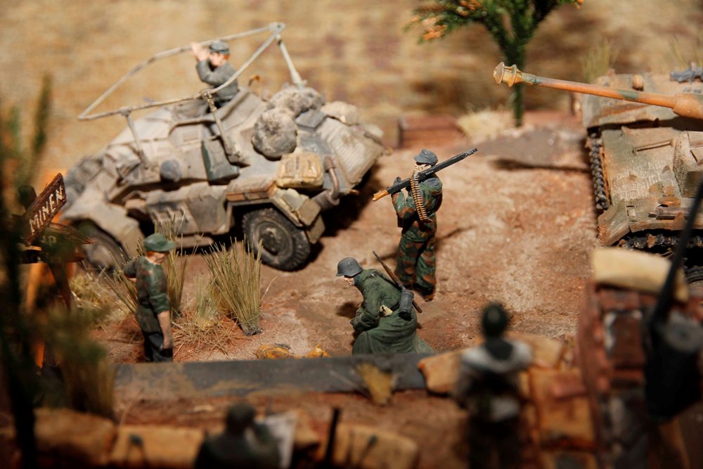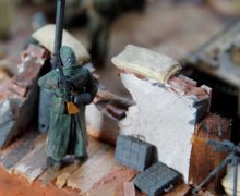 Geschichte: Reservetruppen auf dem Weg in die Kämpfe um Budapest im Oktober 1944. Das Sturmgeschütz und das Sd.Kfz. 222 passieren einen Wachposten an einer klapprigen Holzbrücke. Dort tummeln sich einige Landser um einen Schäferhund. Bau: Das Diorama wurde auf einem Bilderrahmen gebaut. Gips war die Grundlage. Ziegelruine, angedeutete Holzbrücke sind Eigenbau. Infanterie ist von Tamiya, das Sturmgeschütz von Italeri, das Sd.Kfz. ist bereits vor mehreren Jahren gebaut wurden. Das Gras ist aus Pinselhaaren und aus dem Modellbauladen, Hölzer sind aus dem Krippenbaubedarf. Der Schlamm und Pigmente von Mig. Bauzeit waren ca. 3 Monate.