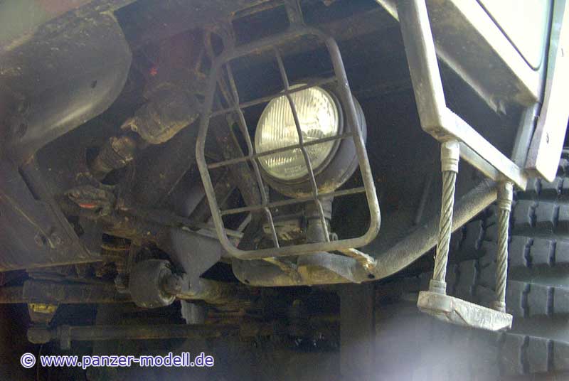 Blick von Links auf Achs-, Lenk und Antriebsgestänge vorn |