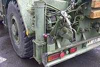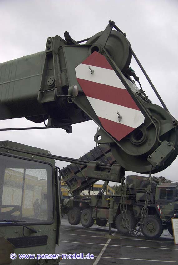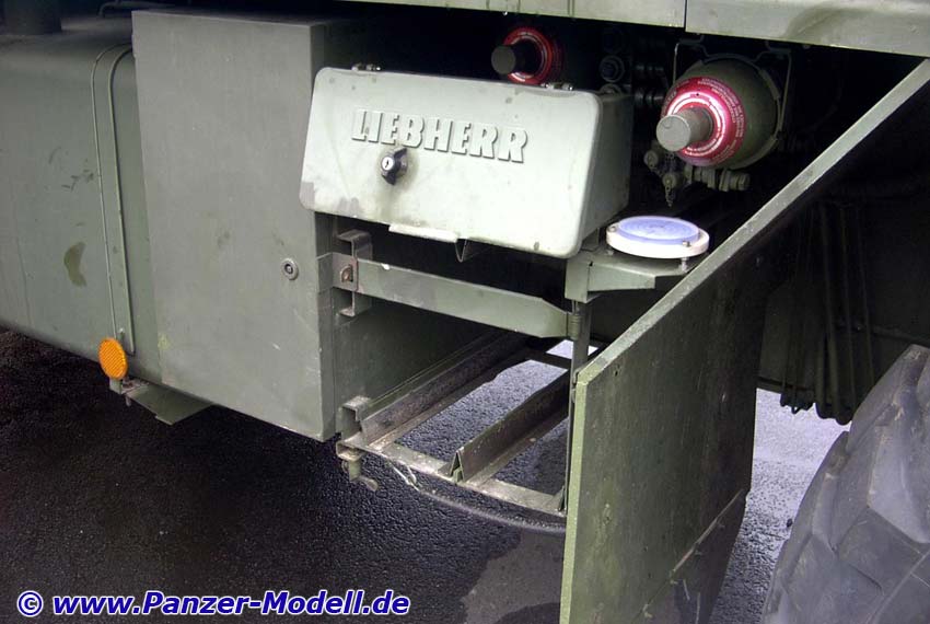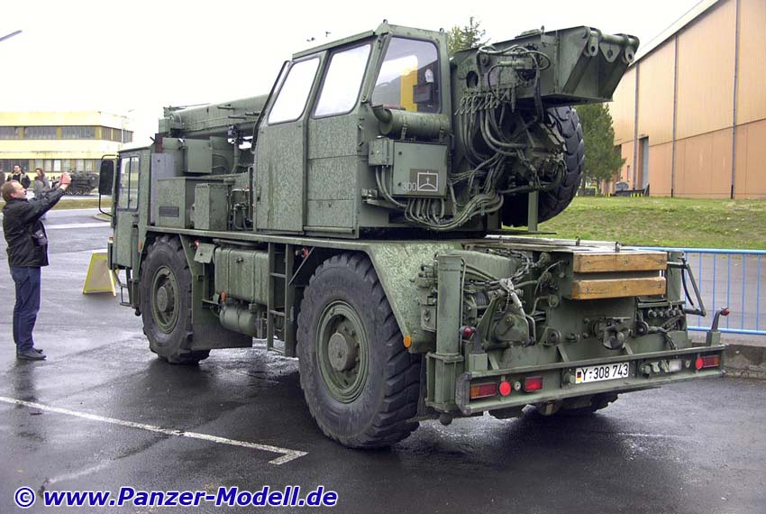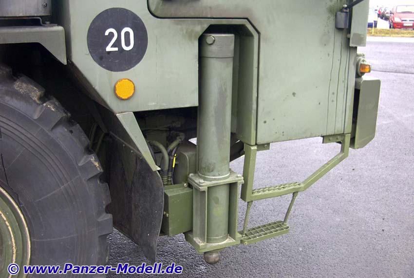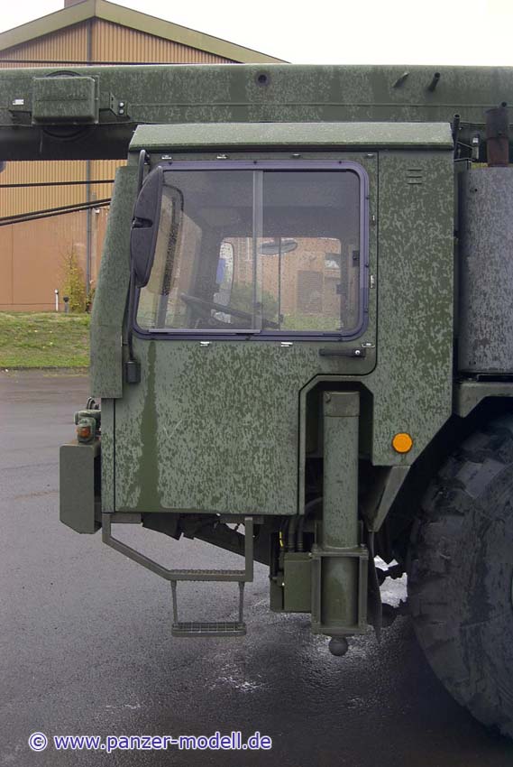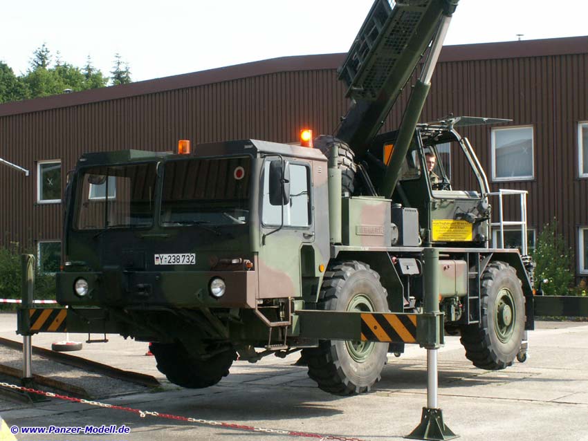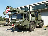 Gesamtansicht vorn links mit aufgestelltem Kran |