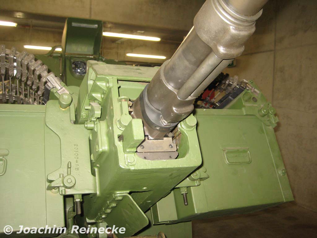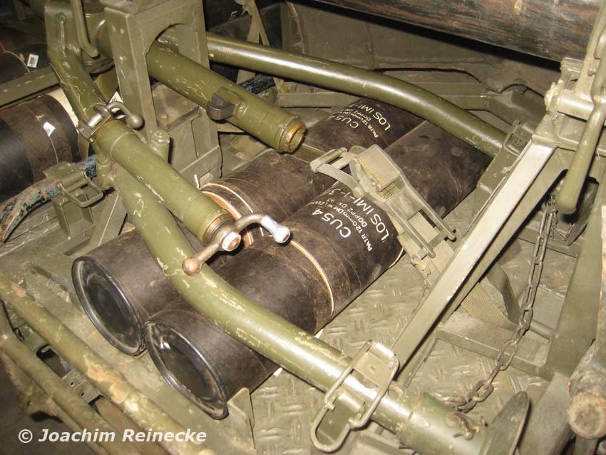 Blick von links auf Mörserrohr und Granatenlagerung