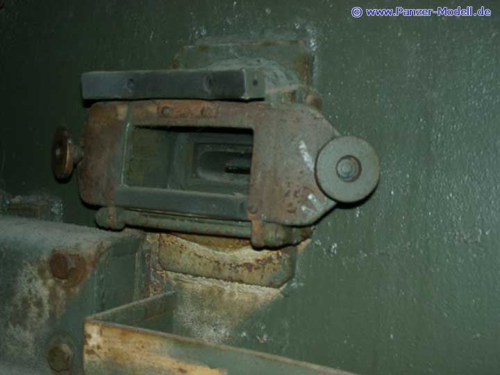 Blick durch die Fahrerluke auf Getriebe und Armaturen Der Fahrerplatz mit innenliegendem Stoßdämpfer Blick von Turmdrehbühne nach vorn zum Getriebe und Aufbaufront Funkerplatz mit MG Munitionslagerung in der Wanne links Munitionslagerung rechts in der Wanne Blick von vorn auf Turmdrehbühne Blick vom Kommandantenplatz runter zum Richtschützen Blick vom Kommandantenplatz rüber zum Ladeschützen Blick vom Kommandantenplatz nach vorn zur Kanonenblende Ladeschützen Luke von innen Die Ausstiegs-/Ladeluke hinten rechts am Turm von innen Hintere Seite des Turms innen, unten die Motorraumtrennwand Das Seitenrichtwerk Beobachtungsschlitz im Turm rechts Die Nahverteidigungswaffe innen Der Verschlussblock