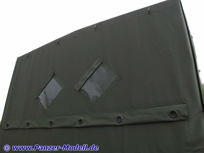 Gesamtansicht hinten rechts mit geöffneter Plane |