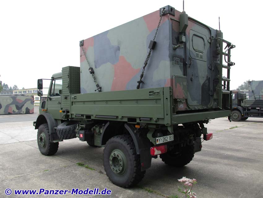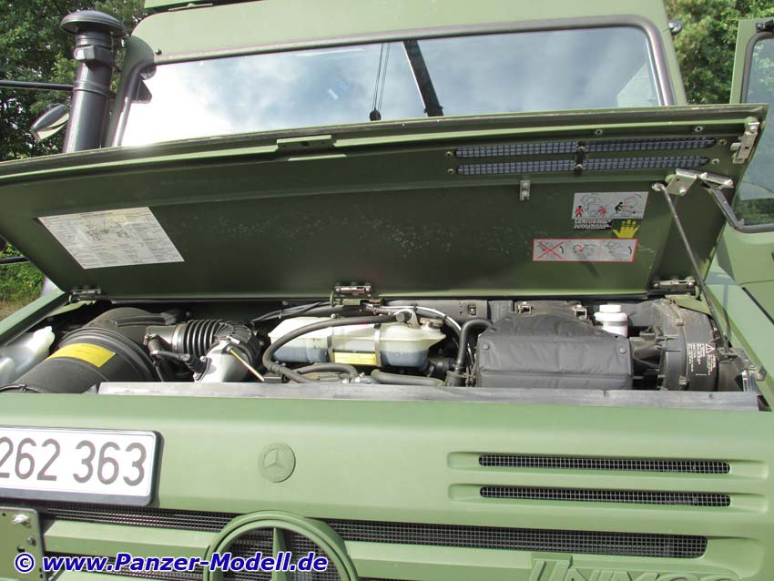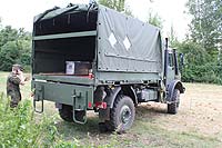 Angetrieben wird der Unimog von einem 4,8 Liter 218 PS Motor. Er kann Steigungen und Gefälle bis 100% und Seiteneigung bis 38° bewältigen. Die Bundeswehr hat sich für die Version mit Radstand 3,85m entschieden. Die Firma Sonntag hat den Pritschenaufbau für die Bundeswehrnutzung entwickelt. Diese Pritsche ist verwindungsfrei mit dem Rahmen verbunden.