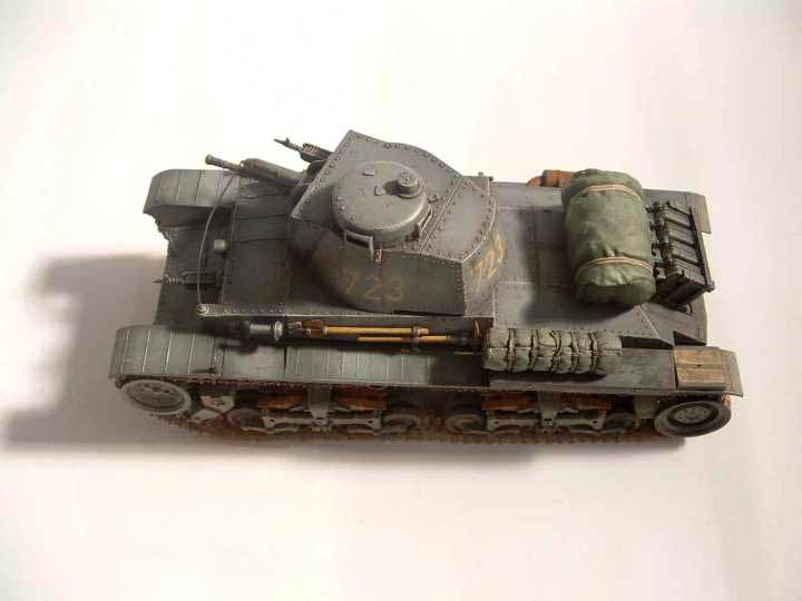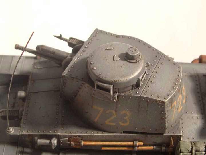 Der Bausatz des PzKpfW35(t) stammt von CMK und weist eine feine Detaillierung auf. Ergänzt wurde das Modell mit einer Friulkette und diversen Teilen aus der Reservekiste. Die Bemalung machte ich mit Valejo Panzergrau, welches ich mehrfach aufhellte, Ölfarben für die dunklen Ränder um die Nieten und Vertiefungen sowie für die aufgehellten Stellen der Grundierung, Enamelfarben für die Lackschäden und zum Abschluß Pastellkreiden für Rost und Staub.