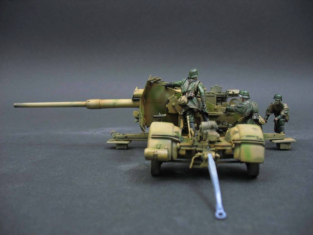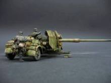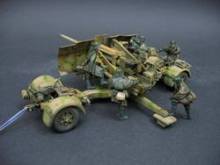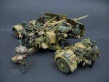 Auf Tarnmaterial habe ich bei diesem Modell verzichtet. Ich habe viele Referenzfotos gefunden, auf denen kein Tarnmuster am Fahrzeug zu erkennen ist. Das Fahrzeug war gegen Ende des Krieges einfarbig in dunkelgelb lackiert. Für die Bemalung habe ich als Basisfarben Life Color Farben verwendet. Mit dunkleren Ölfarben erfolgte dann das Washing des gesamten Fahrzeuges. Anschließend wurde mit verschiedenen Ölfarben ganz leicht trockengebürstet und kleinere Verschleißspuren aufgemalt. Die Detailbemalung und das Finish erfolgten auch mit Ölfarben. Zum Abschluss wurden Schmutz und Staub mit MIG Pigmenten erzeugt.Resinmodell der Flak41 auf Sonderanhänger