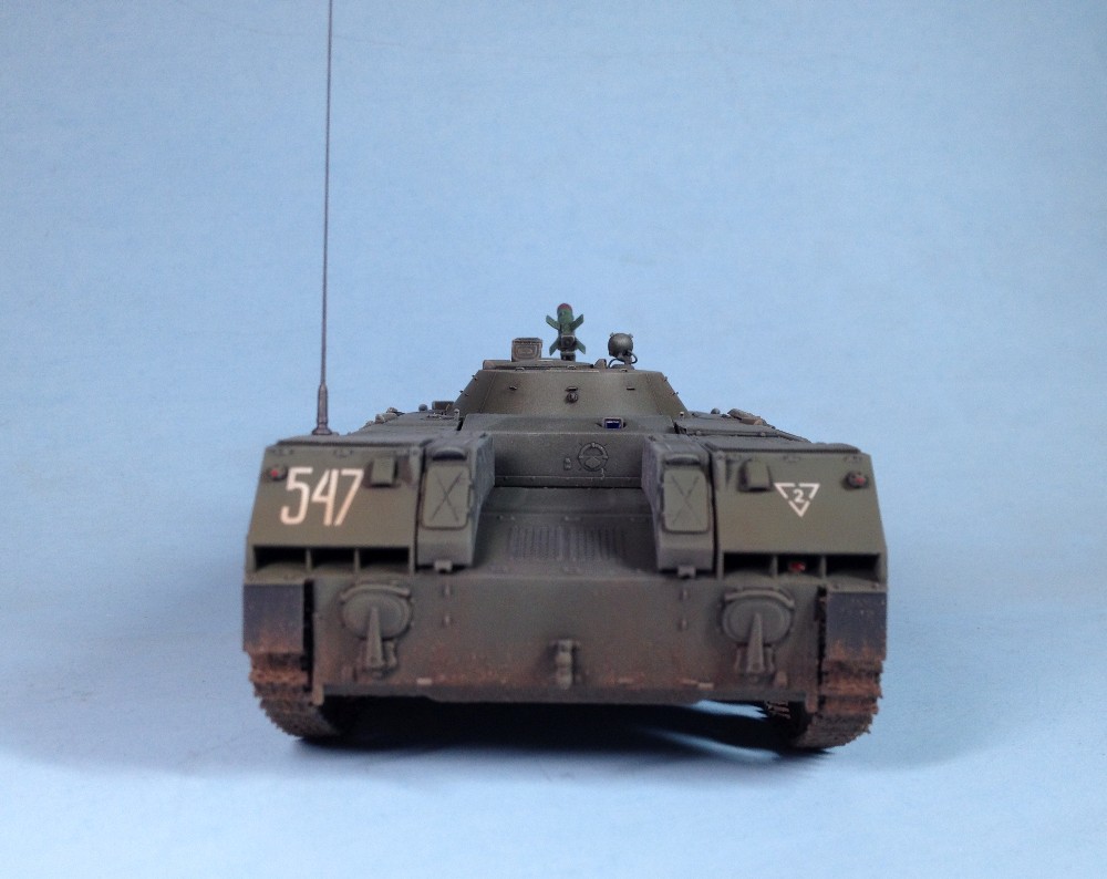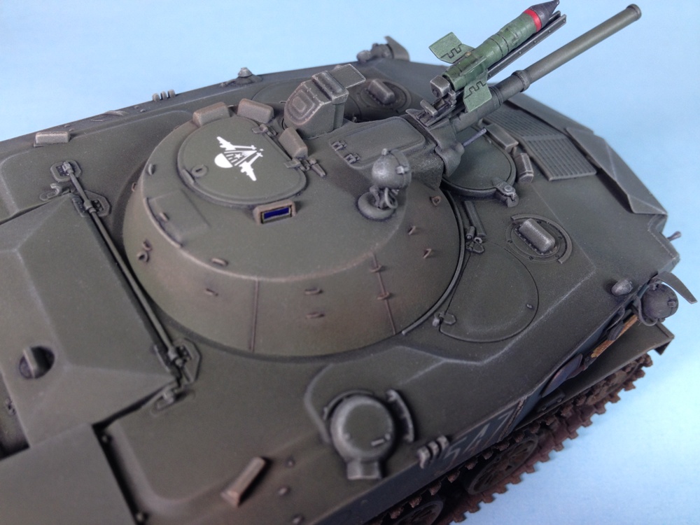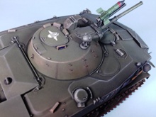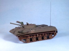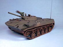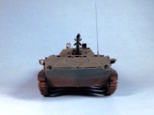 Original text (George Bacon): This is a 1/35 scale model of a Soviet BMD-1 from the Panda Hobby kit #35004. The only additions were some weld beads, especially on the front and sides of the hull, MV Lenses for the lights, and real mud from my backyard (mineral soil that was dried, filtered through a fine screen, and applied as a slurry mixed with white glue). The paints were Testor's Model Master acrylics for the base color, a wash of Windsor and Newton Ivory Black artist's oil paint, drybrushed with Testor's enamels, and the other details painted with various Testor's enamel paints.
