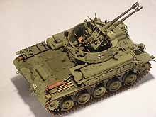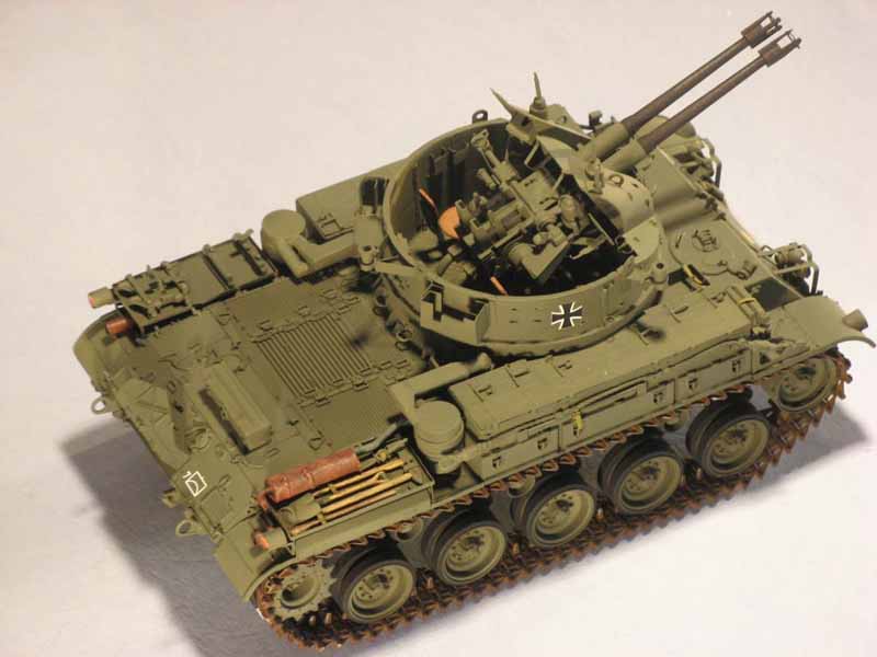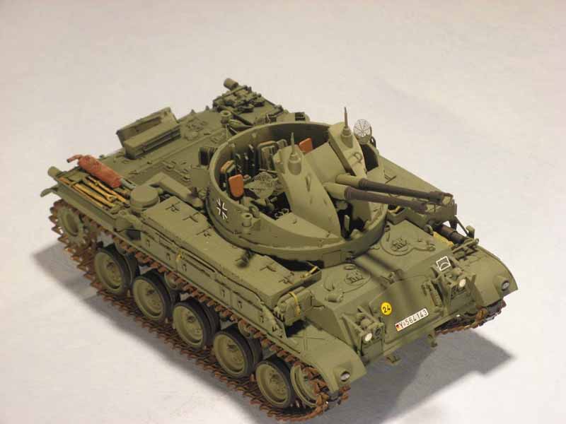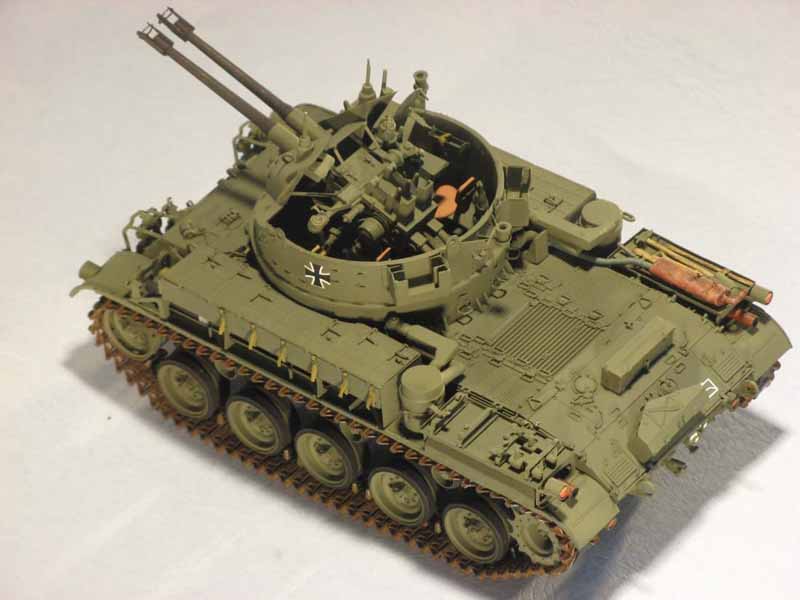 Dann folgte noch das anfertigen von neuen Luftfilterleitungen (je Luftfilter sind es 2 Rohre, eckig und rund), MG-Aufnahmen am Turm, Werkzeug- und Ersatzkettenhalterungen, die seitlichen Munitionskästen, die Staukisten auf dem Heck (bei Tamiya viel zu klein) und Reserve-Flakrohre mit Lagerung. Der Turm und die vordere Oberwanne sind mit Details auch etwas verfeinert worden.