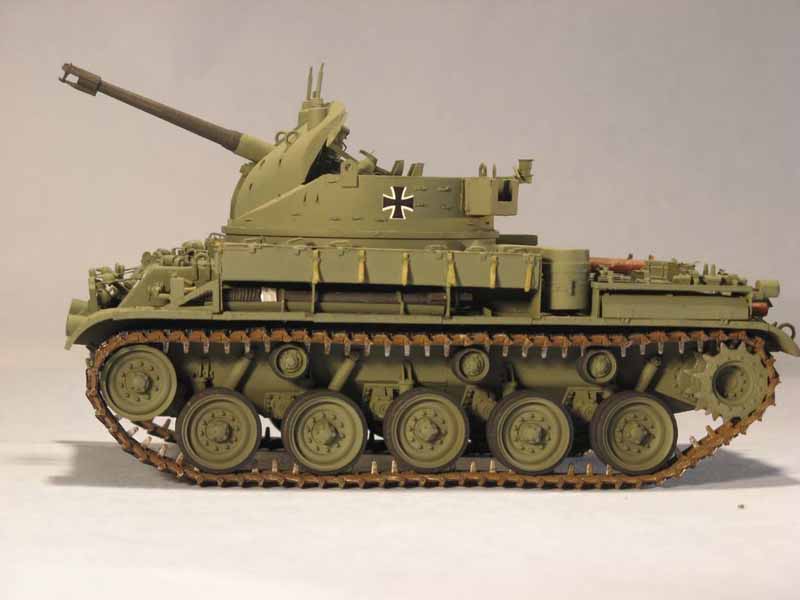 Das Modell von Tamiya bekommt man heute nur noch selten, ich habe es 2007 irgendwo noch entdeckt. Da es aus Tamiyas Frühphase stammt, geht da ohne Eduard-Ätzteile sowieso nichts, denn viele Zurüsteile sind mit angegossen. Schnitzarbeit also. Fahrwerk und Wanne sind ein Tribut an die "Spielzeugzeit" von Tamiya. Also vor dem Zusammenbau das Ding erst mal zerlegt. Ein AFV M41(Bundeswehr) sollte die Wanne und das Motorheck stellen, mangels Alternativen wurden Turm, das Geschütz und Oberwanne inkl. Turmdrehkranz vom Tamiya-Modell beibehalten. Das bedeutete, viele Teile scratch zu bauen.