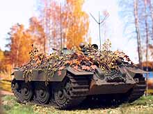 Nun ist Trumpeter diesen Schritt gegangen. Der Bausatz ist gut und relativ schnell zu bauen. Mir ist jedoch aufgefallen, dass Trumpeter die komplette Zieleinrichtung für das 7,5cm KwK L/70 vergessen hat. Diese Zieleinrichtung habe ich auf Basis von den bekannten Jagdpanzer IV Zieleinrichtungen komplett neu nachgebaut. Dann habe ich einen zweiten Antennenfuß und die ab Herbst/Winter 1944 vorgeschriebenen Ringe für die Halterung von Ästen als Tarnmaterial ergänzt. Auf beiden Seiten des Panzers habe ich zusätzliche Ersatzkettenglieder angebracht. Die Auspuffanlage habe ich in der Höhe etwas reduziert, damit sie nicht über das Dach hinausragt. Außerdem habe ich noch einiges an Bordwerkzeug ergänzt und anders angeordnet, als es in der Bauanleitung beschrieben steht. Dann habe ich als Erleichterung für den Einstieg der Mannschaft an der Front des Fahrzeuges eine kleine Leiter gebaut. Das Turm MG habe ich gegen eine 2cm KwK getauscht und für den Nachtkampf eine Infrarot-Zielanlage ergänzt, die ich aus einen alten Tamiya Pantherbausatz übrig hatte. Zum Schluss habe ich aus einen Voyagersatz noch die Schürzen ergänzt. Da Befehlspanzer immer ein Crewmitglied mehr hatten, als normale Jagdpanzer, habe ich dies durch 5 Tarnhelme angedeutet, die ich außen am Fahrzeug angebracht habe.