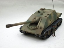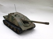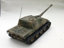 Erbauer: Erich Rauthe Geschichte: Der E100 war das schwerste Fahrzeug aus der E-Baureihe mit E10, 25, 50, 75 und 100. Diese Kennzahlen gaben das angestrebte Gefechtsgewicht wieder. 1943 gab es für den E100 einen Entwicklungsauftrag für die Adlerwerke, der 1944 wieder zurückgezogen wurde. Im Mai 1944 trafen sich Experten von Krupp, Porsche und dem Heereswaffenamt, Thema: Die Entwicklung eines überschweren Jagdpanzers mit 15 oder 17 cm Pak. Porsche brachte wieder seine "Maus" ins Gespräch, die wurde wegen der überdimensionalen Größe, dem Gewicht und Kraftstoffverbrauch abgelehnt. Die Adlerwerke in Frankfurt waren noch mit der Entwicklung der E-100-Serie beauftragt, geplant waren ein Kampf- und ein Flakpanzer, außerdem sollte sich das Fahrwerk zur Aufnahme schwerer Geschütze (Selbstfahrlafette) eignen. So fiel die Entscheidung, auch den Jagdpanzer auf der Basis des E-100 zu entwickeln. Bereits Monate später wurde der Auftrag storniert und das Projekt "Maus" auf Betreiben von Porsche dann doch vorrangig eingestuft. Das Modell zeugt den Jagdpanzer auf E-100-Basis, wie er u.U. nach Meinung der Experten optisch ausgesehen hätte. Techn. Daten: Entwurf: Adler/Krupp, 1944, keine Fertigung