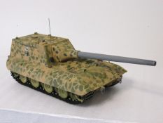 Erbauer: Erich Rauthe Geschichte: Das Stug E-100 war das schwerste Fahrzeug aus der E-Baureihe mit E 10, 25, 50, 75 und 100. Diese Kennzahlen gaben das angestrebte Gefechtsgewicht wieder. 1943 gab es für den Kampfpanzer E-100 einen Entwicklungsauftrag für Adler, der 1944 wieder zurückgezogen wurde. Trotzdem wurde bei Adler weiter an einem Prototypen konstruiert, obwohl die Materialbeschaffung schon schwierig war. Das Stug E-100 sollte auf der E-100 Plattform mit Motor vorne und Kampfraum in einem geschlossenen Aufbau hinten gefertigt werden. Der Kampfpanzer E-100, ursprünglich auf ca. 100 ton festgelegt, kam in der geplanten Endausführung, so wie auch das Stug , dann doch auf 140 ton. Um den Koloss zu bewegen, war ein 1.200 PS V-12 Motor von Maybach geplant. Der E-100 war einer jener Großobjekte, die in der Realität kaum einsetzbar gewesen wären. Wie die „Maus“, wäre der E100 nur als mobiler Bunker einzustufen, da es kaum Brücken gab, die so einen Koloss hätte tragen können. Anfang 1945 gab es wohl keinen Panzer der Alliierten, der dem E100, wäre er zum Einsatz gekommen, gefährlich geworden wäre. Unübersehbare Nachteile waren aber sein Gewicht und der immense Kraftstoffverbrauch. Wie heute bekannt ist, verloren die Deutschen in den letzten Kriegsmonaten mehr Panzer und gepanzerte Fahrzeuge durch feindliche Jagdbomber als durch Feindbeschuss.Techn. Daten: Hersteller: Entwurf bei Adler/Frankfurt, 1944/45, keine Fertigung Gewicht/Maße: 140 ton, 8,75m (mit Rohr 11,37) x 3,85 x 3,32m MotorAntrieb: Maybach V12 Benzinmotor HL230 P30 im Heck, 23880 ccm, 700 PS, Triebrad vorne, Schachtellaufwerk mit je 8 Doppellaufräder Geschwindigkeit: Straße 25 kmh, Aktionsradius: Straße ca. 120 km Bewaffnung: 17 cm Pak 40 Panzerung max: Wanne Front 250/300 mm, sonst 150/200 mm Besatzung: 5/6 Mann