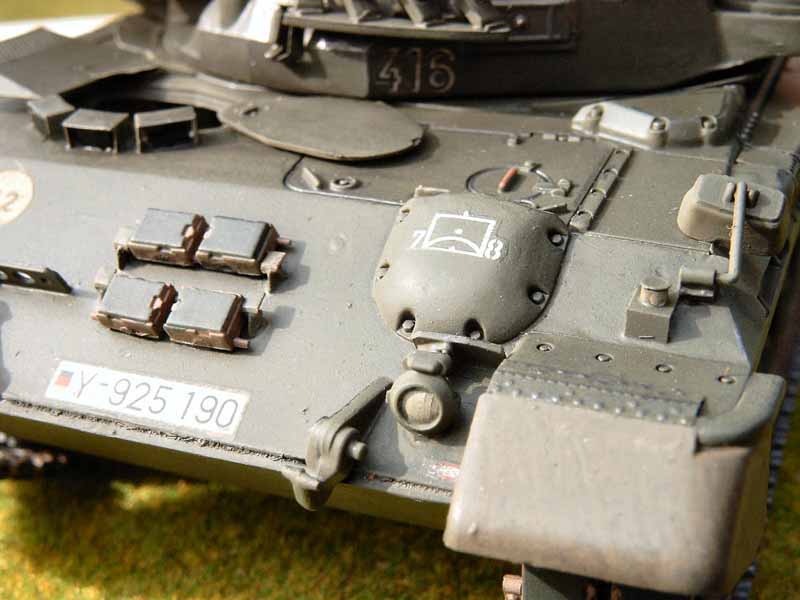So entstand z. B. der Staukasten hinten links über dem ZM-Auspuff scratch, ebenso wie der Fahrerplatz, der duch die offene Fahrerluke sichtbar ist. Die vorderen drei Laufrollen wurden um jeweils 1,5 mm nach vorn verlegt, um den signifikant größeren Abstang zwischen der dritten und der vierten Laufrolle zu erzielen. Vorbildgetreu habe ich die Kettenschürzen weggelassen, da diese bei der Bundeswehr nicht am Gepard motiert wurden und werden.
