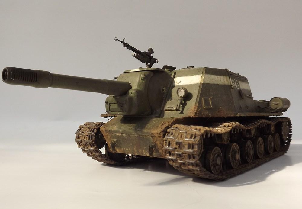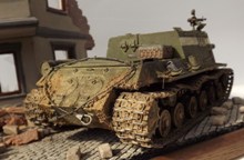 Erbauer: Tobias Wehnert Zubehör: Trumpeter Einzelgliederketten Als Tigerfan muss man sich ja auch mal mit den Gegnern beschäftigen, und da stößt man natürlich zwangsläufig auf die SU/ISU 152 Reihe. Diese überschweren Sturmgeschütze konnten mit Ihrer starken 152 mm Haubitze sowohl Tiger als auch Königstiger ausschalten, litten aber permanent unter der langsamen Schussfolge sowie dem geringen Seitenrichtbereich. Mein Bausatz wurde in einem Italeri-Karton verkauft, ist aber eigentlich ein altes Modell von Zvezda. Damit ist schon alles gesagt, rustikale Detaillierung, fragwürdige Passungen, keinerlei Variantenoptionen. Dies gepaart mit einer völlig verzogenen mehrteiligen Wanne, schlechten Gummiketten und nur einer Decaloption, auch noch der langweiligen 65. Der Bausatz kann natürlich nicht im geringsten mit den neuen ISUs von Tamiya oder Bronco mithalten, auch das schon ältere Dragonteil ist um Welten besser. ABER: Mit etwas Glück kann man diesen Bausatz im Netz für einstellige Eurobeträge abgreifen, so wie ich, ein fairer Preis für einen Ausflug in´s „gegnerische Lager“, wie ich fand. An dem Modell wurden so gut wie keine Extras verbaut, und die Handvoll Teile hat man an einem Wochenende zusammengeklebt. Ergänzt wurden lediglich die großen Haltegriffe am Aufbau aus Draht, eine Glas für den Scheinwerfer sowie ein Schleppseil aus Draht. Die Halter der Zusatztanks wurden von den Tankteilen abgesägt und flacher geschliffen, da ich den Großteil der Tanks weglassen wollte. Die Kettenbleche im vorderen Bereich wurden abgesägt und verschliffen, auf vielen Originalfotos fehlen diese Teile ebenfalls. Die meiste Arbeit machte das einzige Extra, das ich dem Panzer gönnte: Einzelkettenglieder von Trumpeter. Diese sind sehr schön in braunem Plastik gespritzt, und werden jeweils mit zwei kurzen (und ziemlich zerbrechlichen) Kettenbolzen verbunden. Das Ergebnis ist eine sehr filigrane und bewegliche Kette, welche das ISU deutlich aufwertet, ist so doch erst die Darstellung des bei Sowjetpanzern charakteristischen Kettendurchhangs möglich. Danach wurden noch die Brennspuren an den Kanten aller Platten nachgebildet, sowie auf allen Flächen eine Struktur mittels verschiedener kleiner Fräser und Mr. Surfacer aufgebracht. Der „Schlamm“ (aus Holzleim, Staticgras und Sand) wurde bereits vor der Lackierung aufgebracht. Lackiert wurde mit Revell Acryl, die Decals entstammen dem Fundus. Der weiße Streifen wurde aufgemalt. Gealtert wurde dann mit diversen Washings, sowohl Fertigprodukte von AK und Mig als auch selbst gemachte Ölfarbwashings fanden Anwendung. Der vorher aufgebrachte Dreck wurde dann überwiegend mit AK Produkten (Earth Effects, Fresh Mud usw.) koloriert, eine abschließende Mikrobemalung erfolgte mit Vallejo German Camo Black Brown. Zum Abschluß wurden noch intensive Metalleffekte auf den Lauf- und Stützrollen, den Triebrädern sowie den Ketten mittels Graphit und einem Silberstift von Karisma aufgebracht. Ein netter kleiner Ausflug auf die andere Seite, und aufgrund des minimalen Bauaufwandes wirklich was für zwischendurch.