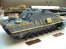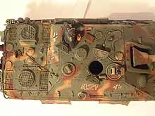 Das Modell wurde mit einem Ätzteilesatz von RoyalModell verfeinert. Der Behälter für das Rohrwischgerät sowie die Deckel der Staukästen am Heck entstanden aus dickerer Alufolie, die Seitenschürzen aus Kupferblech. Das Abschleppseil ist aus gezwirbeltem Draht hergestellt. Grundiert wurde das Modell zunächst in schwarz matt, anschließend wurde mit ModelAir und Tamiya lackiert. Darüber kam eine Schicht Klarlack glänzend um die Decals anzubringen danach wiederum eine Schicht ModelAir Mattlack. Anschließend kam ein Washing aus schwarz-brauner Farbbrühe und Drybrushing mit sandgelb von Humbrol. Gealtert wurde mit Pastellkreide, Ölfarbe, Farbpulver und Graphitstift. Der Auspuff wurde mit echtem Rost von Microrealistixx behandelt. Die Figur ist von Dragon mit einem Warriors-Kopf.