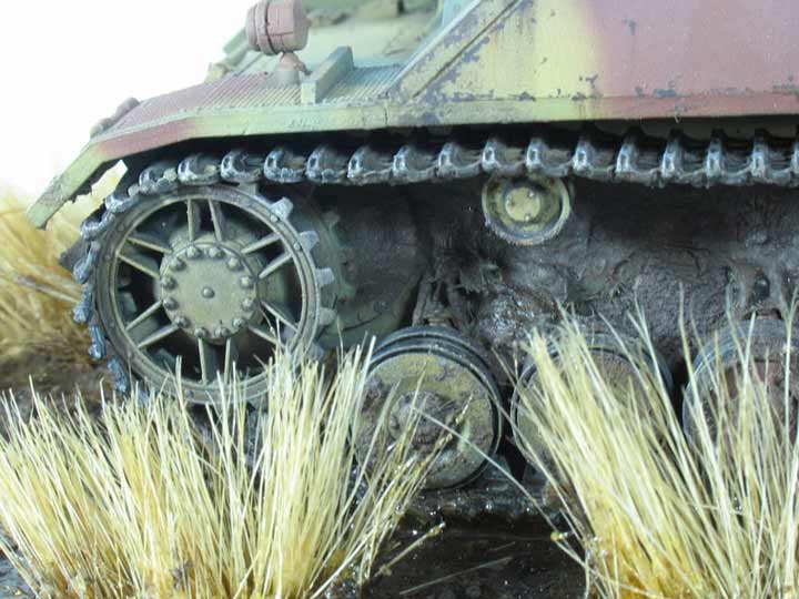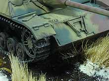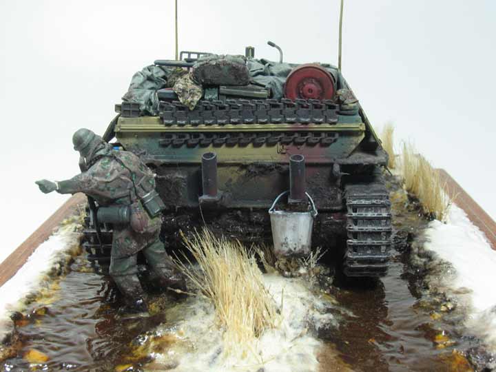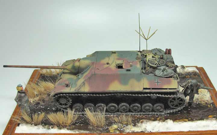 Der Jagdpanzer IV späte Ausführung (Dragon) ist direkt aus der Schachtel gebaut, an der Fahrzeugfront befindet sich eine Preiser Flüchtlingsfigur, am Fahrzeugheck ein Soldat der Marder Besatzung des Tamiya Bausatzes. Der Soldat bekam einen Verlinden Kopf, sowie einen Schal, eine Zeltbahn aus Zellstoff, und eine Handwaffe.