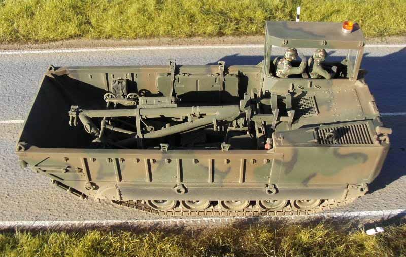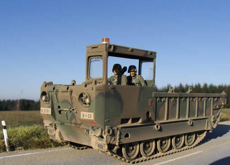 Da Perfect Scale die BW- Version des M-752 wählte, musste ich für meine US-Version einpaar Kleinigkeiten ändern. Außerdem ergänzte ich noch drei Schweißnähte im Bereich der Fahrerkabine und des Motors, da mir diese auf div. Fotos noch aufgefallen waren. Die Farben (Tamiya) für den MERDC II Tarnanstrich mischte ich wieder selbst. Zunächst wurde das Modell mit "grün" grundiert, danach folgten die braun Flecken u. zum Schluss die schwarzen "Krähenfüße". Die Bumbercodes setzte ich wieder aus TL-Decals zusammen. Dem Bausatz liegt zwar eine AFV-Club Gummikette bei, aber mir gefallen die Friul.-Ketten etwas besser, das muss eben jeder für sich entscheiden. Nachdem das Modell fertig lackiert war u. alle Decals angebracht waren, wurde das ganze Modell mit Gunze Mattlack H-20 versiegelt. Die MIG - Pigmente gaben dem Ganzen wieder den schmutzig- staubigen Look. Die Figuren entnahm ich meiner Restekiste, diese stammen von Tamiya Hummerbausätzen und passten ohne weiteres in die Fahrerkabine. Die Rundumkennleuchte machte mir wieder ein guter Freund u. Clubkamerad. Die Fotos entstanden draußen an den original "Schauplätzen" von damals, auf meinen beiden Gelände/Straßen-Grundplatten...