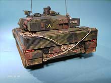 Anders als meine anderen Modelle, wurde dieser Leo komplett (ausgenommen der grünen Grundfarbe) mit dem Pinsel bemalt. Nach einigen Jahren im Dienst bei der Bundeswehr, wurde der Tarnanstrich nicht immer mit der Spritzpistole ausgebessert. Einige Panzer erhielten Bemalungen mittels Pinsel (siehe Buch: Leopard 2 A5-bei Übung und Einsatz, Stöckler).