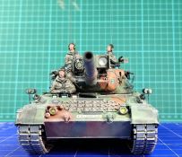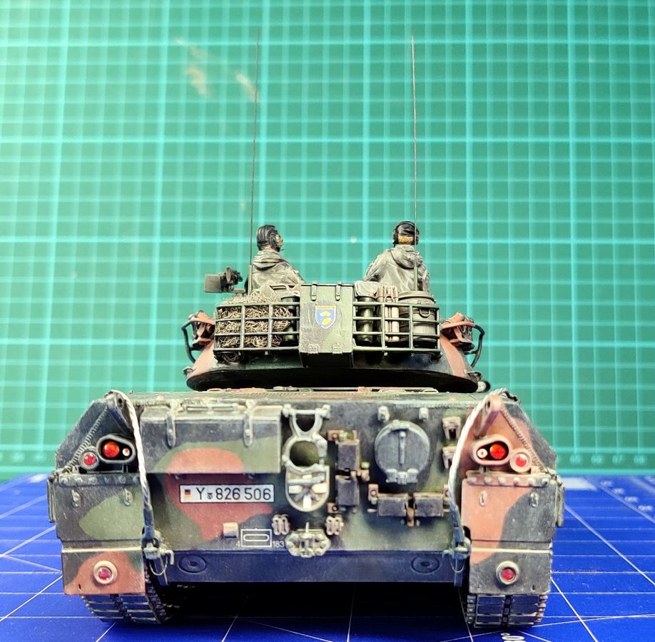 Erbauer: Gunnar Toletzki Gebaut aus dem Meng Bausatz TS-015 Leopard 1A5 und dem Perfect Scale Rüstsatz 35073 Leopard 1A2 Turm Das Modell wurde mit Vallejo Black Primer grundiert und mit Vallejo Nato-Green Primer als Grundfarbe versehen. Die Tarnfarbe wurde mit Teerschwarz von Revell und Red Brown von AK 3073 lackiert. Fertiggestellt im November 2022. Dargestellt ist ein Fahrzeug der 4 Kompanie vom Panzerbattalion 183.