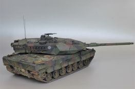 Erbauer: Mario Schlitter ORIGINAL: Leopard 2 Zusammenbau: Damit der Zusammenbau leicht von der Hand geht, sollte man vorher die Bauanleitung studieren. Besonders hervorheben möchte ich die beweglichen Ketten und das Fahrwerk. Durch das Eigengewicht vom Panzer geht das Fahrwerk realistisch "in die Knie". Lackiert und gealtert wurde das Modell mit Vallejo Farben und Pigmenten.