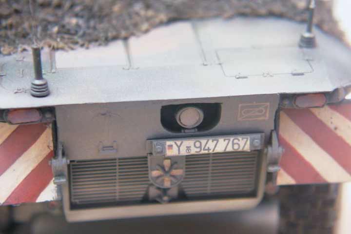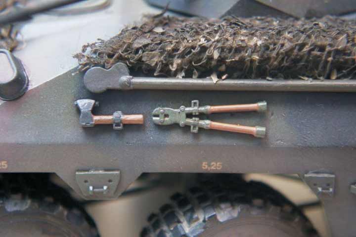 Die Tarnnetze wurden in Eigenbau erstellt. Es handelt sich hierbei um Mullbinden, die zunächst in Weißleim getränkt wurden. Anschließend wurden sie mit Gartenkräuter bestreut und auf das Modell gelegt. Nach dem Trocknen wurden sie mit Vallejo Farben bemalt.