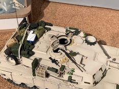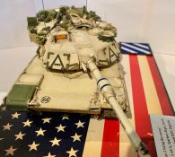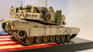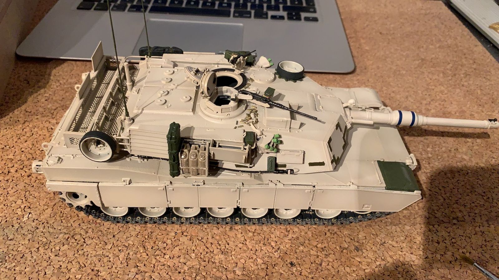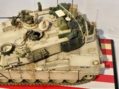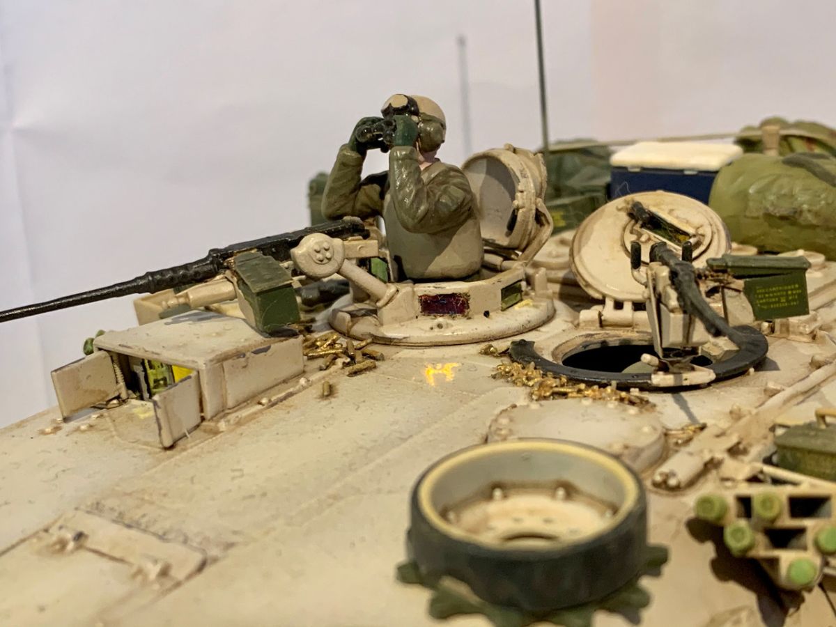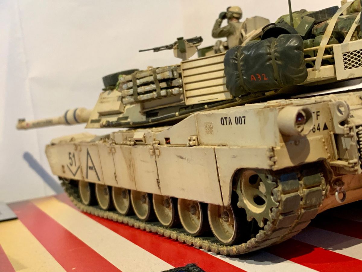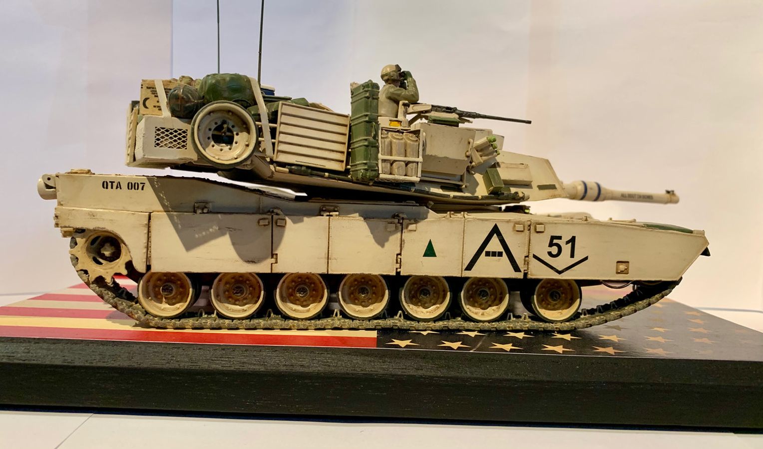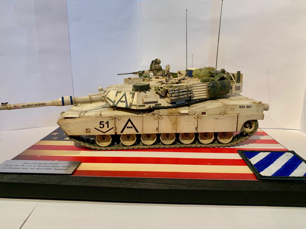 Erbauer: Kim-Eric Borchardt Das Modell zeigt den M1A1 HC „Blue 2“ (oder auch Alpha Three Two), nicknamed „All bout da Bones“, 3rd Platoon, Alpha Company, 1st Bataillon “Desert Rogues” des 64th Armor Regiment der 2nd Brigade “Spartans” der 3rd Infantry Division (mechanized). Das erste Bataillon des 64th AR der Spartans bildete die Task Force 1-64 Armor während der Operation Iraqi Freedom im März / April 2003. Blue 2 nahm dabei an der gesamten Operation der 3rd ID teil, wurde also von Kuwait ausgehend bis nach Baghdad gefahren und gehörte dort Anfang April zu den Fahrzeugen, welche die beiden Thunder Runs der Division zur Einnahme der Stadt durchgeführt haben. Dabei waren die Fahrzeuge neben Infanterie und Technicals auch mit Bunkern und BMPs konfrontiert, welche mit HEAT-Rounds ausgeschaltet wurden. Die Fahrzeuge von 1-63 A waren durch den zügigen Marsch von Kuwait bis Baghdad ziemlich mitgenommen. Innerhalb der Stadt wurde dann während des Thunder Runs enorm viel 50.cal und M240 Munition verschossen. Beides habe ich versucht, im Modell einzufangen. Mein Modell zeigt Blue 2 während des 1. Thunder Runs am 5. April, unmittelbar vor dem Abfeuern der Main Gun. Der Loader hält sich bereit, eine zweite HEAT-Round zu laden. Das Fahrzeug verfügt über einige unverkennbare Merkmale, welche mein Modell berücksichtigt. So war der Fender vorne links beschädigt und verbogen, die Gummilippe fehlte. Der rechte Fender wurde schon in Kuwait gegen einen neuen in Forrest Green getauscht. Das Fahrzeug hatte passend zum Namen einen Spielzeug-Totenkopf auf der Kanonenblende, welcher im Original beleuchtet war. Am Auspuff fehlte das mittlere Gräting, auf der linken Fahrzeugseite war auf mittlerer Höhe eine Spur Flüssigkeit (Öl o. ä.), da vermutlich durch einen Handwaffen-Treffer etwas im Staukorb ausgelaufen ist. Auch bei der Beladung des Panzers habe ich mich möglichst an Fotos orientiert. Am rechten Wannenheck verfügt Blue 2, wie einige M1A1 von 1-64, über Aufnahmeösen für eine EAPU. Referenzen: Burik/Olson, THUNDER RUN: The 3rd Infantry Division´s Drive To Baghdad, Concord-Verlag, 2005.Zucchino, Thunder Run The Armored Strike To Capture Baghdad, 2004. Modell: Dragon Nr. 3535 M1 A1 AIM, 1:35, Umbau auf M1A1 HC von 1-64, Figuren von Miniart, Beladung von Tamiya, Meng und Legend, Antennen von Leopard Club, Folie auf den Winkelspiegeln von Afv-Club Lackierung: AMIG US Modern Vehicles, aufgehellt in mehreren Schichten mit AMIG Light Sand Grey und Weiß; Lackierung via Airbrush Decals: Aus der Box, bei Dragon gibt es Blue 2 als Decalvorschlag (mit falschen Platoon-Ringen, da die Decals dafür schwarz sind) Washing: AMIG US Modern Vehicles Wash OIF/OEF Weathering: Chipping mit AMIG, Pigmente von AMIG, Modulation mit Oilbrushern von AMIG Base: Flaggensockel und Schild von Diosockel, dazu ein Patch der 3rd ID