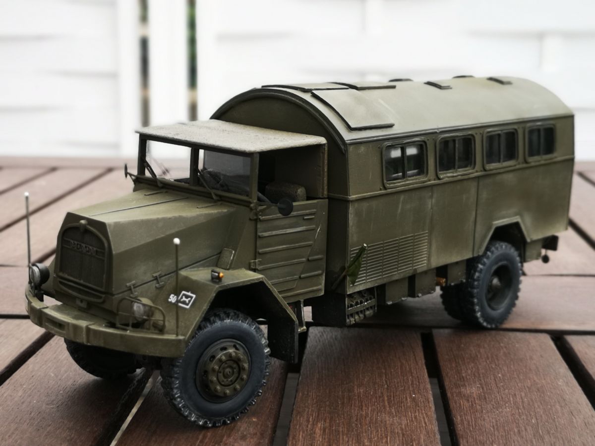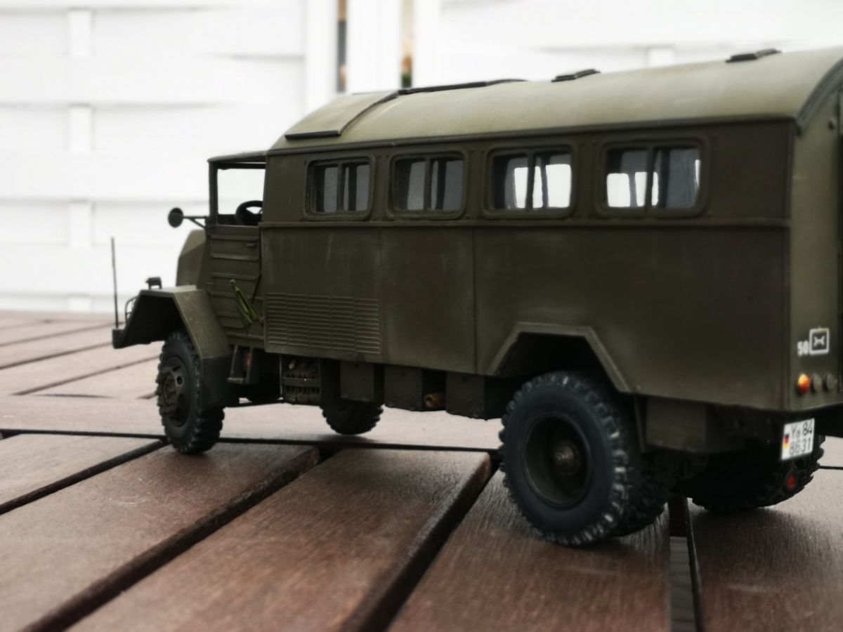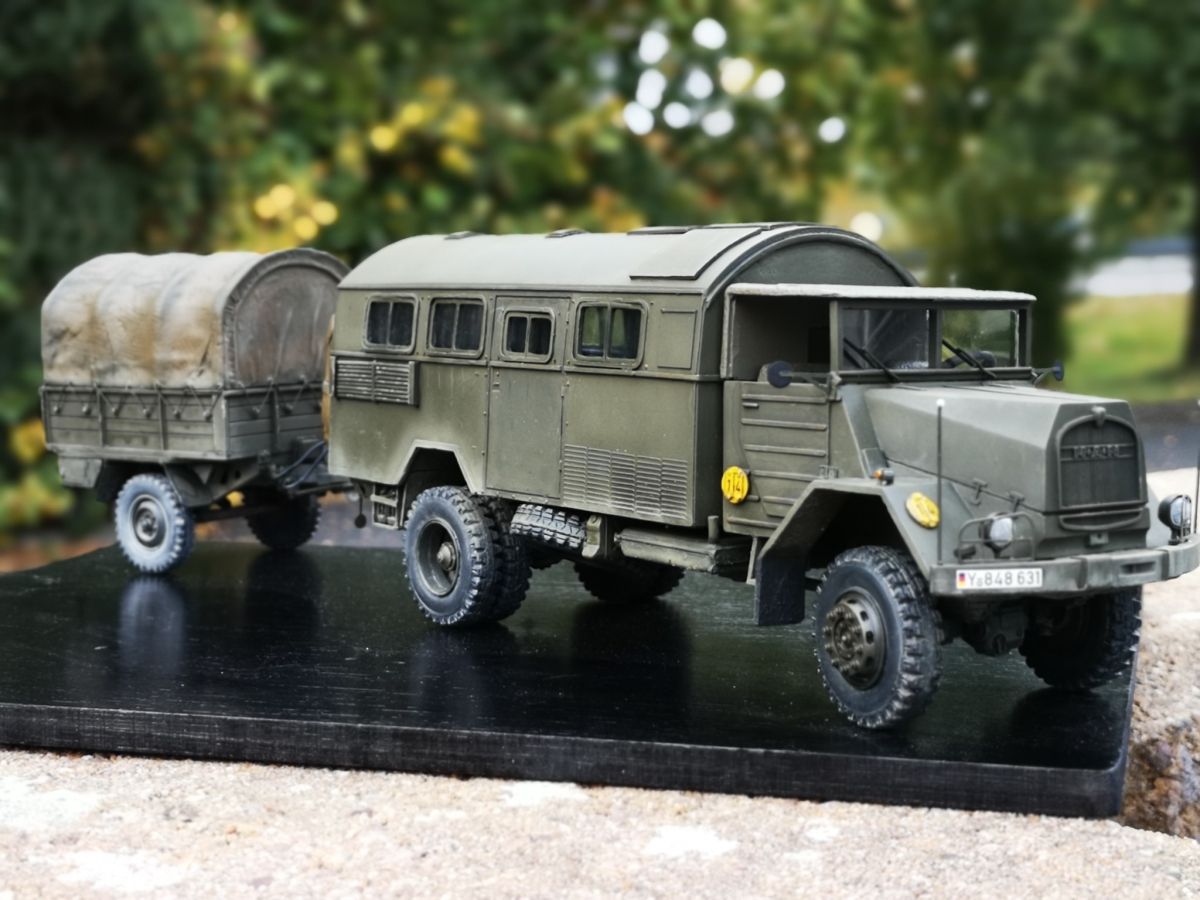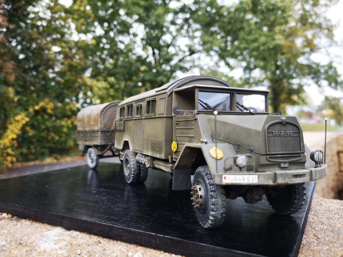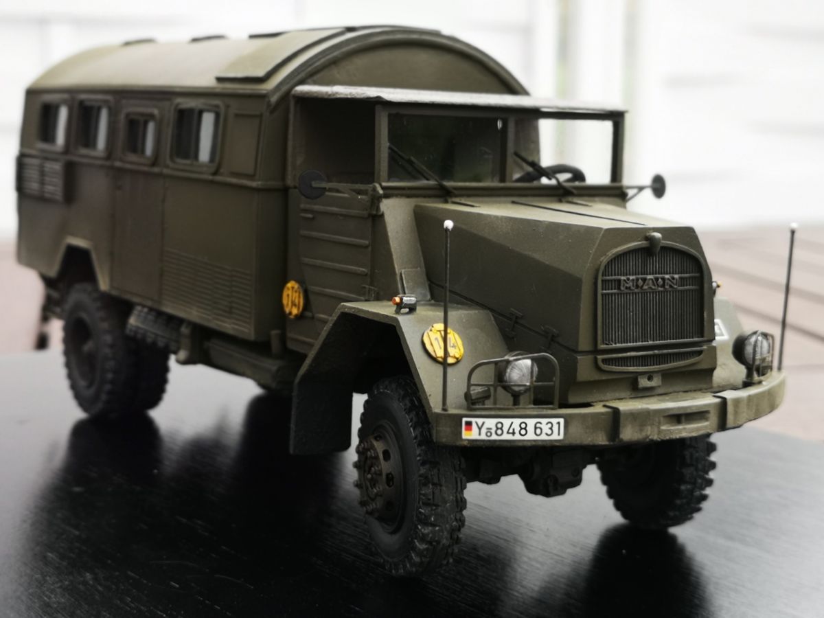 Erbauer: Johannes Bernhardt Original: MAN 630 Im Sommer 2023 habe ich mal meine Restekiste ausgekippt, um zu gucken was sich die Jahre so angesammelt hat. Nach kurzer Zeit habe ich verschiedene Einzelteile von einem alten Gollwitzer MAN 630 Koffer gefunden. Mir war sofort klar, den musste bauen. Wer das Modell kennt, weiß dass das Modell sehr einfach gehalten ist, aber die Teile verdammt gut passen. Ich habe daher mich auf die nötigsten Details beim Zusammenbau begrenzt. Es sollte ja eine Resteverwertung sein und zudem hatte ich bis dahin kein vernünftiges Referenzmaterial zur Emma. Die Reifen und Felgen sind von Jürgen Kreissl, der mir die kurz vor seinem Tod noch geschickt hatte. Die Radnabe ist von eine Tiger 1 Teil, was ein wenig an die Originalradnabe rankommt. Ich hoffe das die Emma gefällt euch trotzdem.