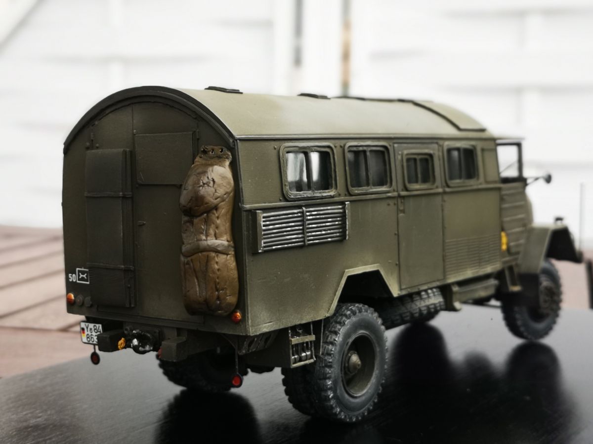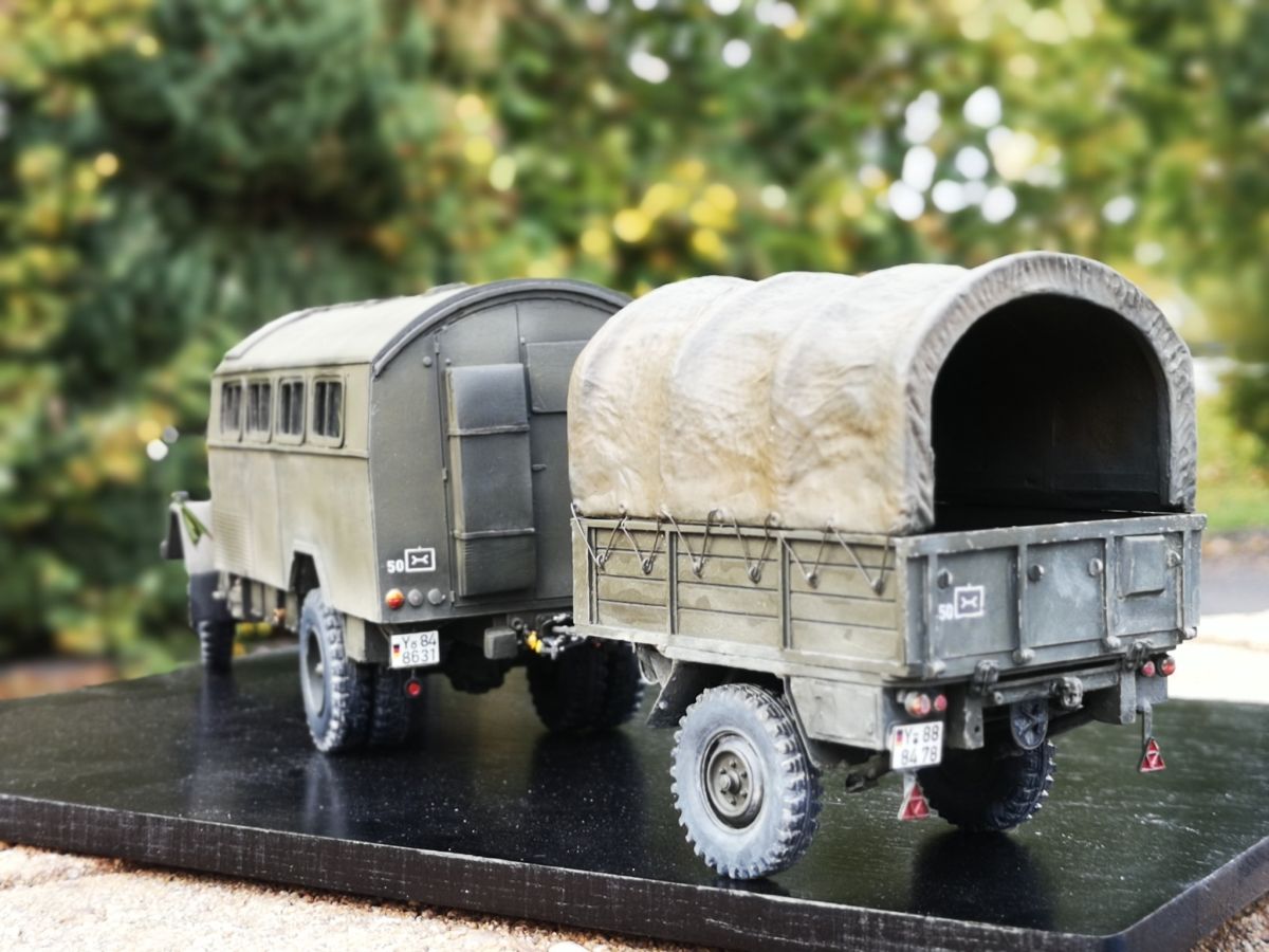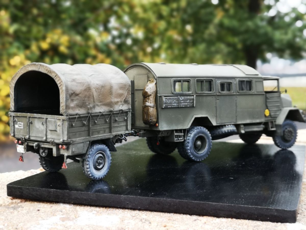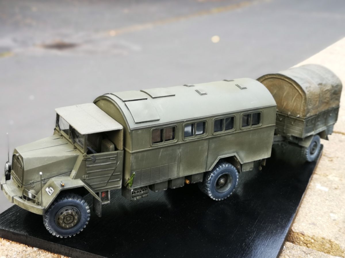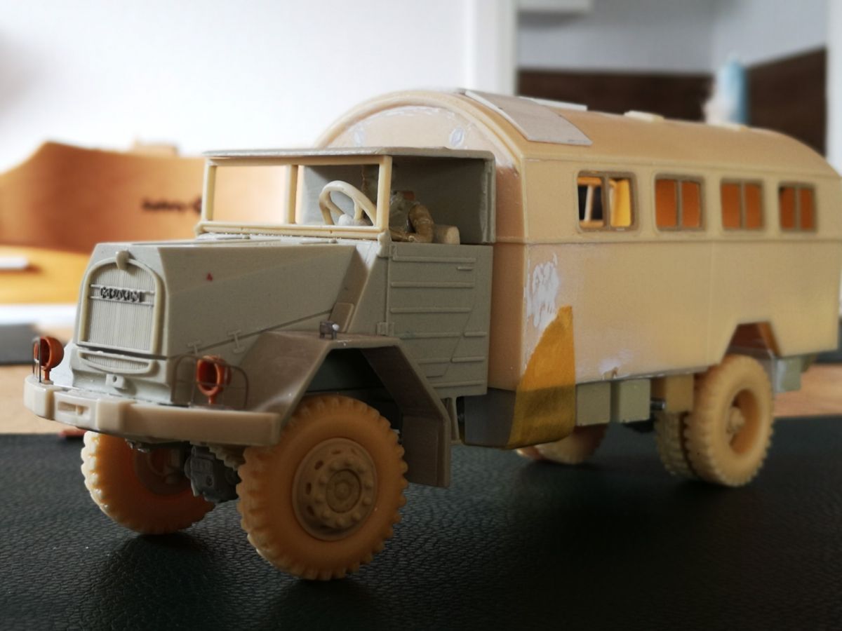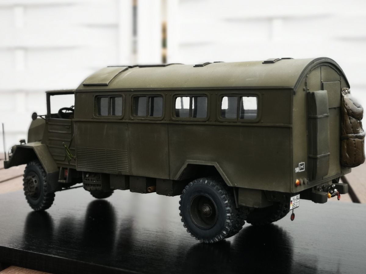 Erbauer: Johannes Bernhardt Original: MAN 630 Im Sommer 2023 habe ich mal meine Restekiste ausgekippt, um zu gucken was sich die Jahre so angesammelt hat. Nach kurzer Zeit habe ich verschiedene Einzelteile von einem alten Gollwitzer MAN 630 Koffer gefunden. Mir war sofort klar, den musste bauen. Wer das Modell kennt, weiß dass das Modell sehr einfach gehalten ist, aber die Teile verdammt gut passen. Ich habe daher mich auf die nötigsten Details beim Zusammenbau begrenzt. Es sollte ja eine Resteverwertung sein und zudem hatte ich bis dahin kein vernünftiges Referenzmaterial zur Emma. Die Reifen und Felgen sind von Jürgen Kreissl, der mir die kurz vor seinem Tod noch geschickt hatte. Die Radnabe ist von eine Tiger 1 Teil, was ein wenig an die Originalradnabe rankommt. Ich hoffe das die Emma gefällt euch trotzdem.