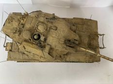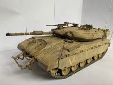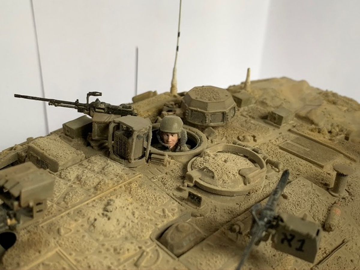 Erbauer: Kim-Eric Borchardt ORIGINAL: Merkava Das Modell zeigt einen Merkava 3D LIC in der späten Ausführung der IDF. Dargestellt ist der 2. Panzer des 1. Zuges („1 Alef“) der 1. Kompanie „Venus“ des 2. Bataillons „Sa’ar“ (Sturm) der 188. Panzerbrigade „Barak“ (Blitz) während der Operation Cast Lead im Januar 2009 im Gazastreifen. Das Fahrzeug ist ausgerüstet mit dem vollständigen LIC-Paket (Gitter an mehreren Motor- und Lüfteröffnungen, Gitter an den Optiken, neue Kommandantenkuppel, Belly Armour, Abschlepphörner vorne und hinten samt Ketten, Pistolenblende in der Heckklappe usw.) und trägt die späte Version der Zusatzpanzerung am Turm. Das Modell hat einen selbst erstellten Anti-Rutsch-Belag aus Vogelsand erhalten, da der Meng-Bausatz über keinen verfügte. Gezeigt wird das dargestellte Fahrzeug während bzw. nach dem Kampf in einer Stadt des Gazastreifens, daher mischt sich im Weathering der Fahrstaub mit dem Staub der Gebäudetrümmer. Ebenfalls wurde das Fahrzeug möglicherweise mit Steinen beworfen, was durch entsprechende gräuliche und ockerfarbene Pigmente simuliert wird. Modell: Merkava Mk. 3D LIC late von Meng, 1:35 zzgl. Legend Staukörbe für den Merkava 3; die Figur müsste von Royal Model sein (gleiches Set wie beim Mk. 4M)