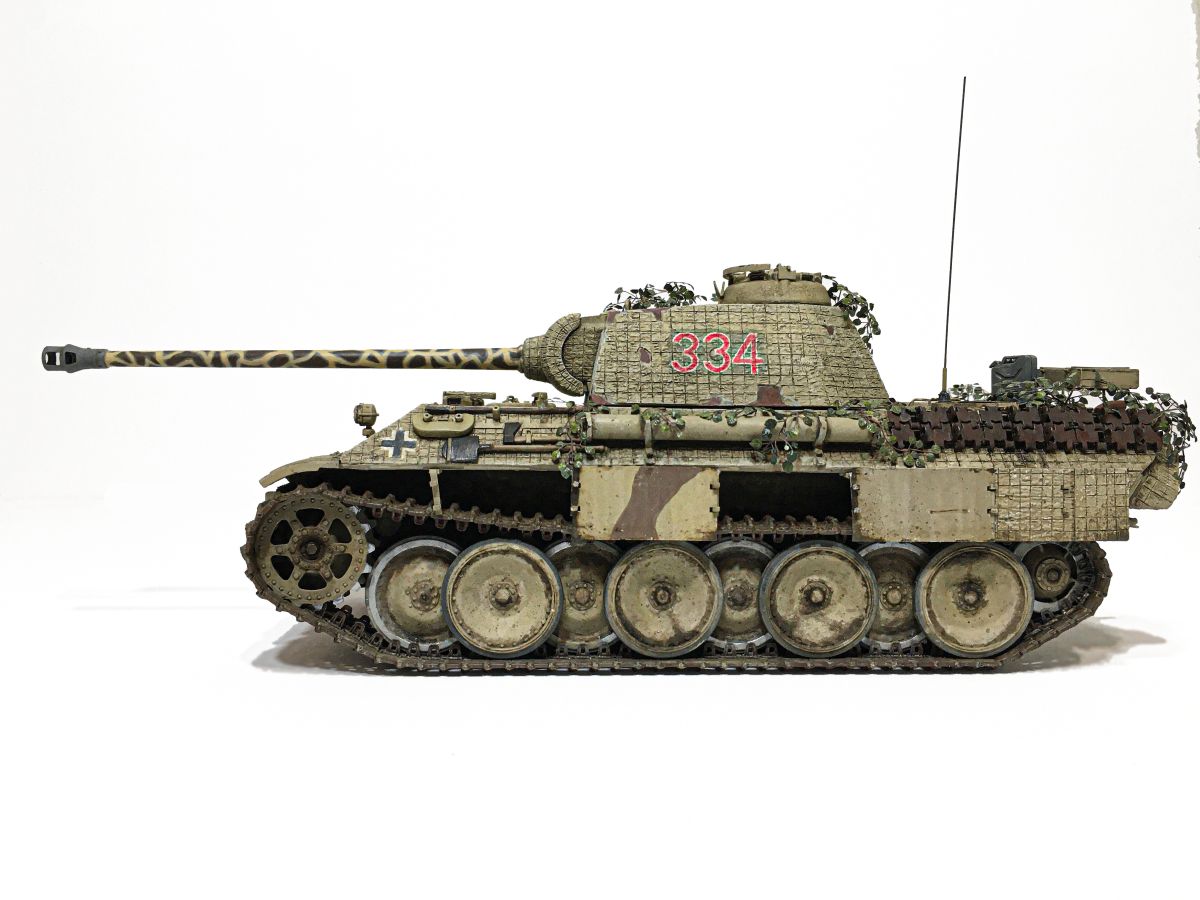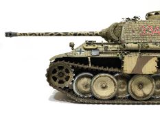 Erbauer: Preston Stinger Original: Panzerkampfwagen V Panther Das Werk 1:35 Panther A Early. For the zimmerit I used Atak Resin Zimmerit so that I could create realistic chipping and damage. This specific model was built to represent tank 334 from the 1.Abteilung/4.Panzer regiment in Italy with the interesting camouflage painted on the barrel. Although not a perfect representation, it satisfies my personal requirements and tastes. The main color I used was RAL7028 and for the highlights I used Iraqi Desert Sand from the AK-Interactive Real Colors line. I weathered with Ammo's Wash for Dark Yellow vehicles and used various Ammo textured earth products to create the mud and splatter effects. I finished it off with Alliance 1:48 Photo Etched Foliage for the leaf camouflage. Das Werk 1:35 Panther A Early. Für das Zimmerit habe ich Atak Resin Zimmerit verwendet, um realistische Abplatzungen und Schäden zu verursachen. Dieses spezielle Modell wurde gebaut, um den Panzer 334 des 1.Abteilung / 4.Panzer-Regiments in Italien mit der interessanten Tarnung auf dem Rohr darzustellen. Obwohl es keine perfekte Darstellung ist, erfüllt es meine persönlichen Anforderungen und Geschmäcker. Die Hauptfarbe, die ich verwendet habe, war RAL7028 und für die Highlights habe ich irakischen Wüstensand aus der AK-Interactive Real Colors-Linie verwendet. Ich habe mit Ammos Wash for Dark Yellow-Fahrzeugen verwittert und verschiedene strukturierte Ammo-Erdprodukte verwendet, um die Schlamm- und Spritzereffekte zu erzielen. Ich beendete es mit Alliance 1:48 Photo Etched Foliage für die Blatttarnung.