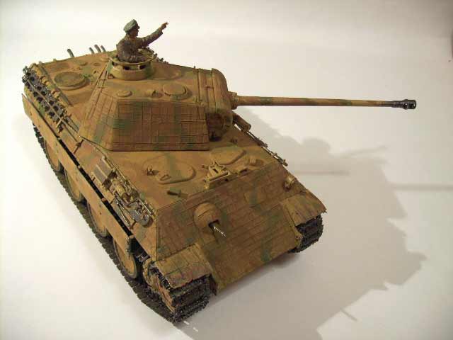Das ist mein erstes Modell von einem deutschen Panzer in 1:35. Das Modell stellt einen Panther Ausf. A der Panzer Lehr Division, bei dem Vorstoß nördlich von St.Lo am 12.7.1944, dar. Das Zimmerit habe ich mit einem heißen Messer eingeritzt. Die Figur ist aus dem Wiking Division Set von Dragon (6131). Bemalt wurde das Modell mit Humbrol- und Tamiyafarben. Anschließend wurde das Modell noch mit Pastellkreide gealtert.
