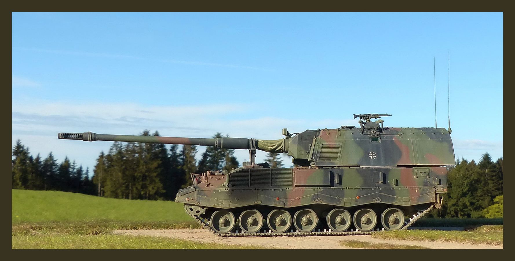 Erbauer: Ralf Rost Original: Panzerhaubitze 2000 Hierbei handelt es sich um die PzH 2000 von MENG. Das Modell wurde bis auf wenige PE Teile (Restebox) aus der Schachtel gebaut. Für Lackierung und Alterung verwendete ich wieder XF Farben von Tamiya, washings von AK und Mattlack von Gunze. Das Modell wurde auf meinen beiden Basisplatten bei Sonnenschein vor realem Hintergrund fotografiert.