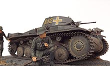 Erbauer: Tobias Wehnert Es handelt sich hier um den neuen Panzer II Ausf. C in der Version für den Polenfeldzug von Tamiya.. Ein tolles Modell, Tamiya-typisch mit wenigen Teilen, dafür von toller Passgenauigkeit. Absoluter Bastelspaß pur. Dementsprechend wurde hier auch eigentlich OOTB gebaut, ergänzt wurde nur ein kleines Geländer für das Gepäck. Alles andere kommt so aus dem Kasten, Klasse fand ich vor allem die Ketten und das Ätzteil für den Auspuff. Lediglich das aufgerollte Plastikschleppseil für den Wannenbug gefiel mir überhaupt nicht, glücklicherweise hat Tamiya die „Aufwickelhilfen“ auch noch mal ohne Seil beigefügt, so dass man es weglassen kann. Ich ergänzte stattdessen ein Seil aus Draht. Die Antenne ist mal wieder eine optische Faser, sie wurde wie beim Original mit einer kleinen Metallachse klappbar gestaltet. Lackiert wurde mit Revell-Acryl, gealtert mit Lukas- und Schminckeölfarben sowie MIG-Pigmenten, Drybrushing erfolgte mit verschiedenen Humbrol-Enamels. Die Markierungen stellen einen Panzer der Panzerabteilung 33 der 4 leichten Division im Polenfeldzug dar. Die Decals ließen sich mit Mr. Mark Softer als Weichmacher super verarbeiten, die Balkenkreuze wurden in Gelb nachgemalt, da mir das originale Gelb zu grell erschien. Die Figuren liegen dem Panzer bei, sind für Tamiya-Figuren erstaunlich brauchbar und passen toll zur Szene. Bemalt wurden sie mit Revell Acryl, gealtert mit Ölfarben. Dazu passt dann auch die Grundplatte mit einem Mauerstück mit polnischem Hetzpropagandaplakat und einem Stück Pflasterstraße.