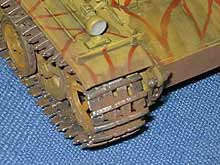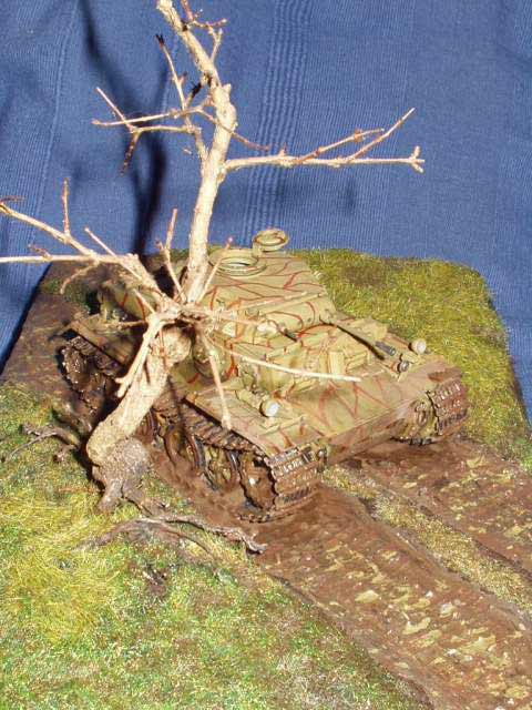 Fahrspuren hineingekratzt. Dies war mein erster Versuch mit feuchtem Schlamm. Um die Feuchtigkeit darzustellen habe ich glänzenden Klarlack genommen. Der Rasen ist Streurasen aus dem Eisenbahnbedarf, der Baum ein vertrockneter Bonsai.